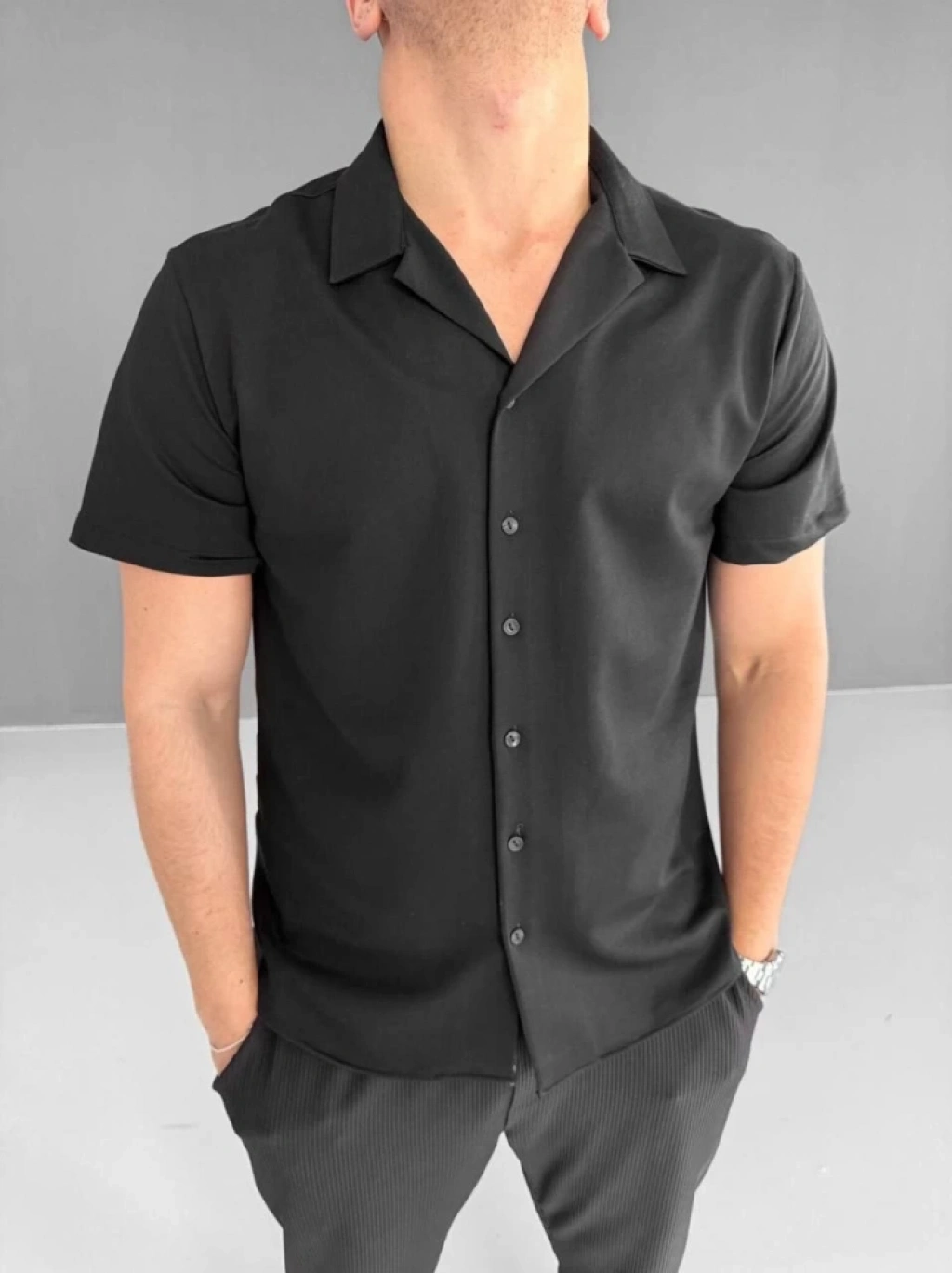 MARSiLYAN- Erkek Waffle Kumaş Kısa Kollu Gömlek Şort Takım Regular Fit Yazlık İkili Set - Siyah