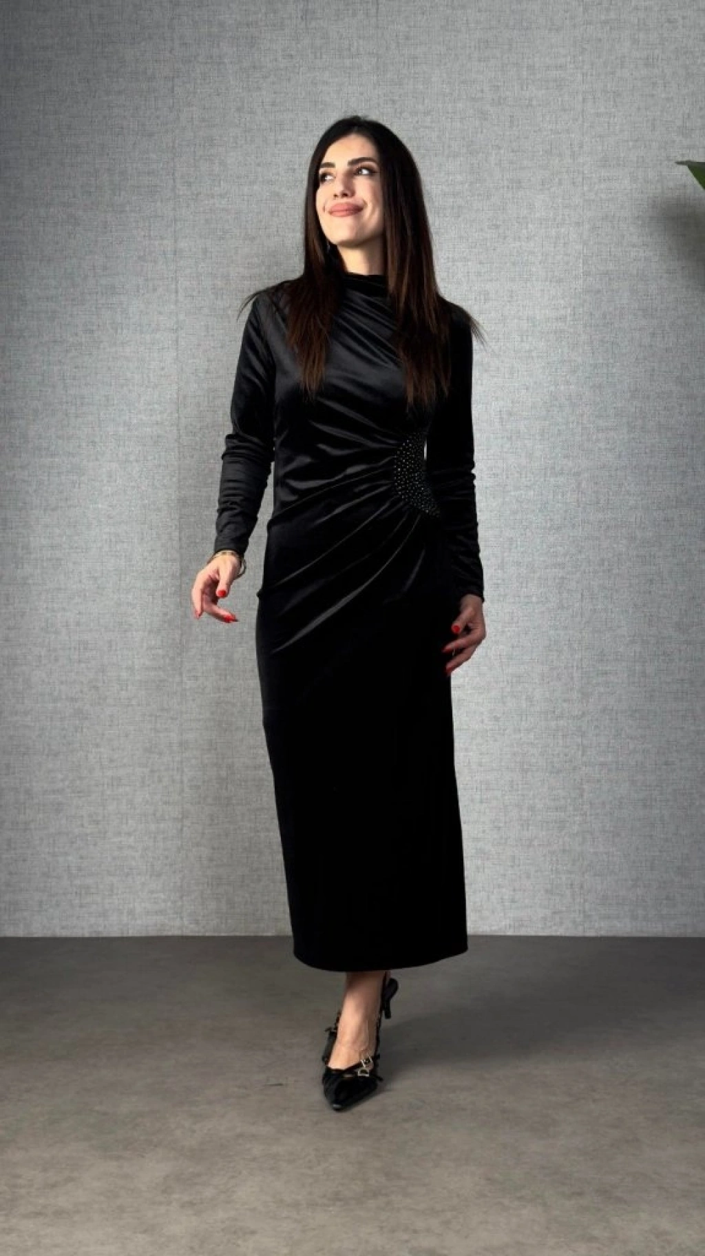 Kadı Uzun Kollu Omuzdan Büzgülü Yandan Taş Detaylı Uzun Kadife Elbise