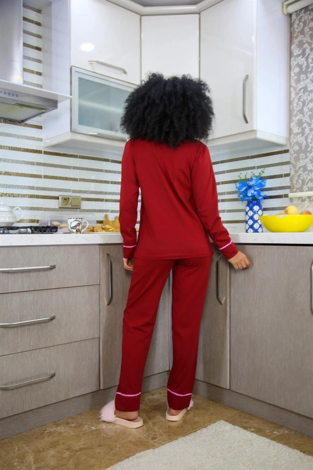 Kadın %100 pamuk penye önden düğmeli uzun kol pijama takım bordo, Çamaşır Kenti kalitesiyle gecelerinizi şenlendirecek.
