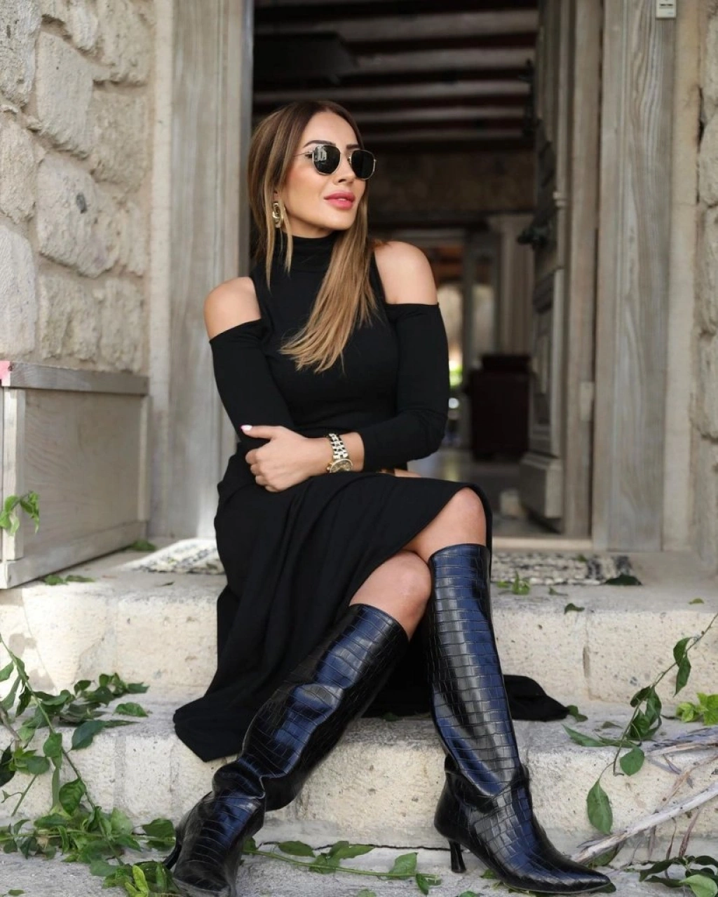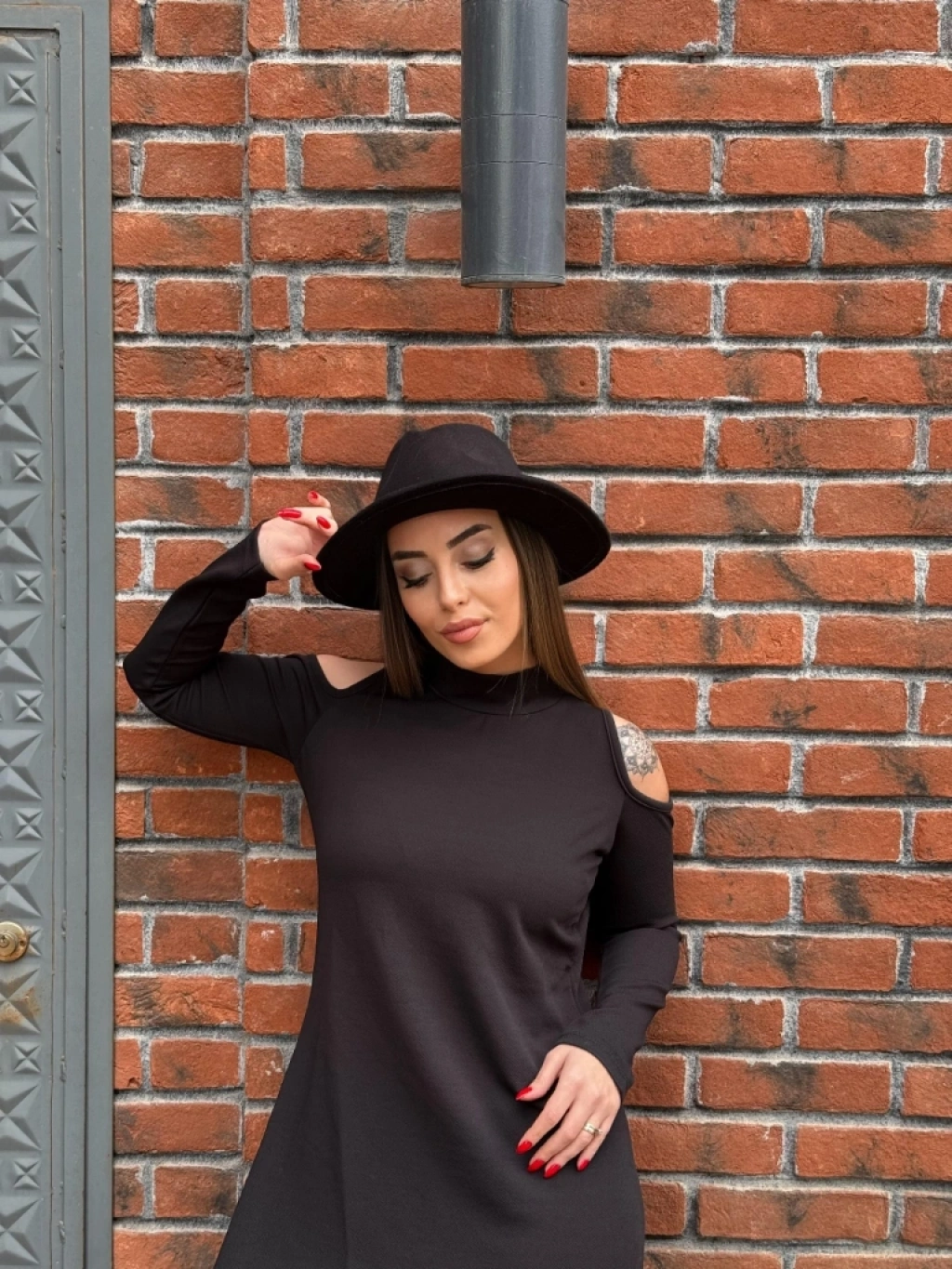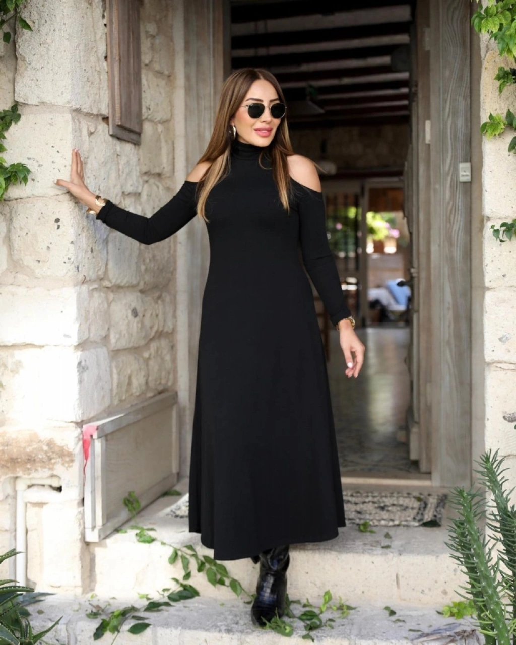 Kadın Balıkçı Yaka Omuzlardan Açık Uzun Kollu Janjan Krep Elbise