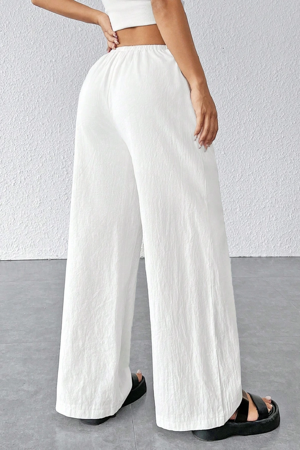 Şıklık ve rahatlığı bir arada sunan kadın beyaz bol kesim geniş paçalı çift cepli dökümlü pantolon, günlük kullanım ve özel kombinler için ideal bir seçimdir.