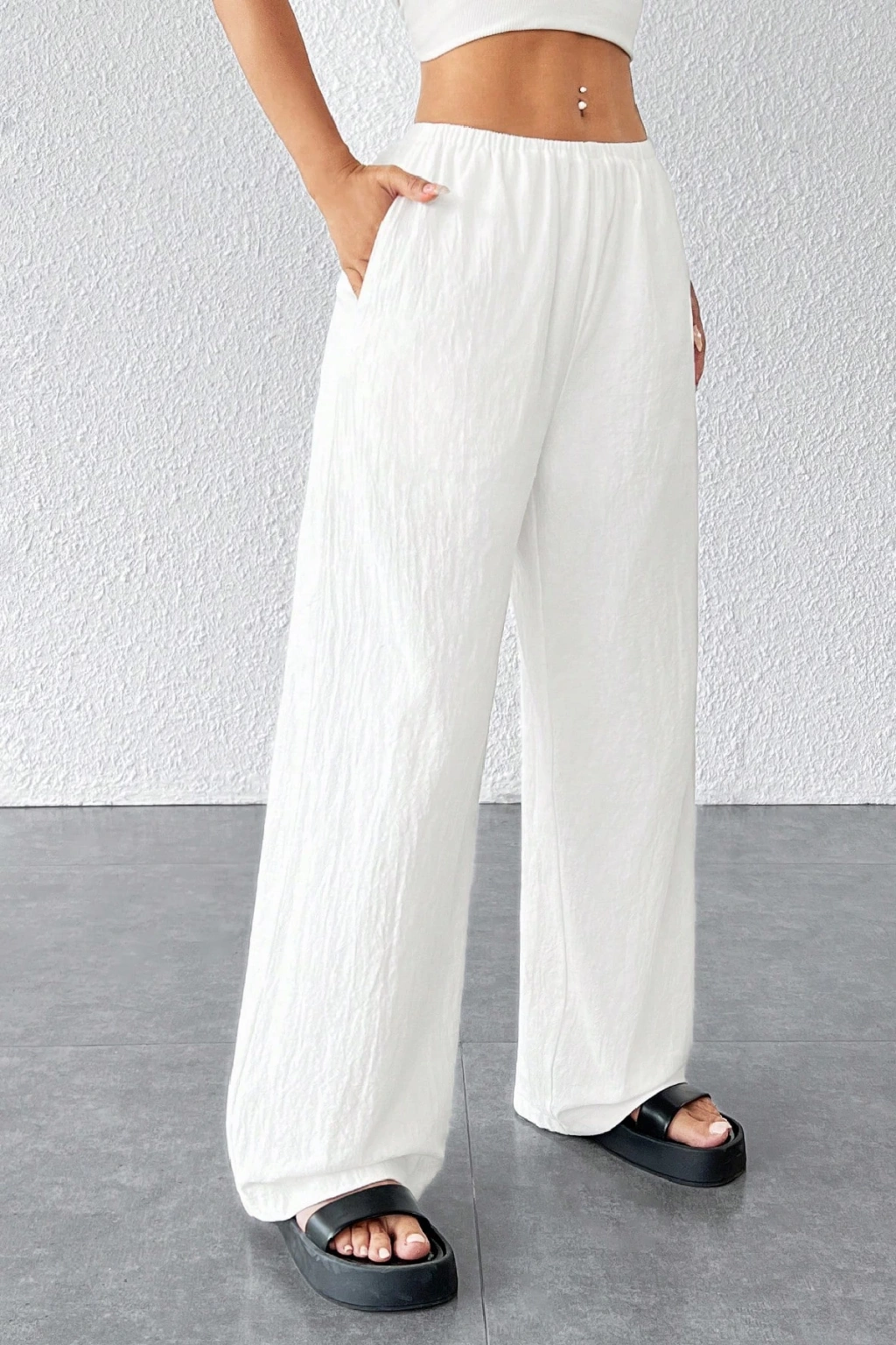 Günlük gezilerde, tatilde ya da ofis şıklığında kolayca kombinlenebilen bu kadın pantolon, beyaz rengiyle her tarza uyum sağlar.