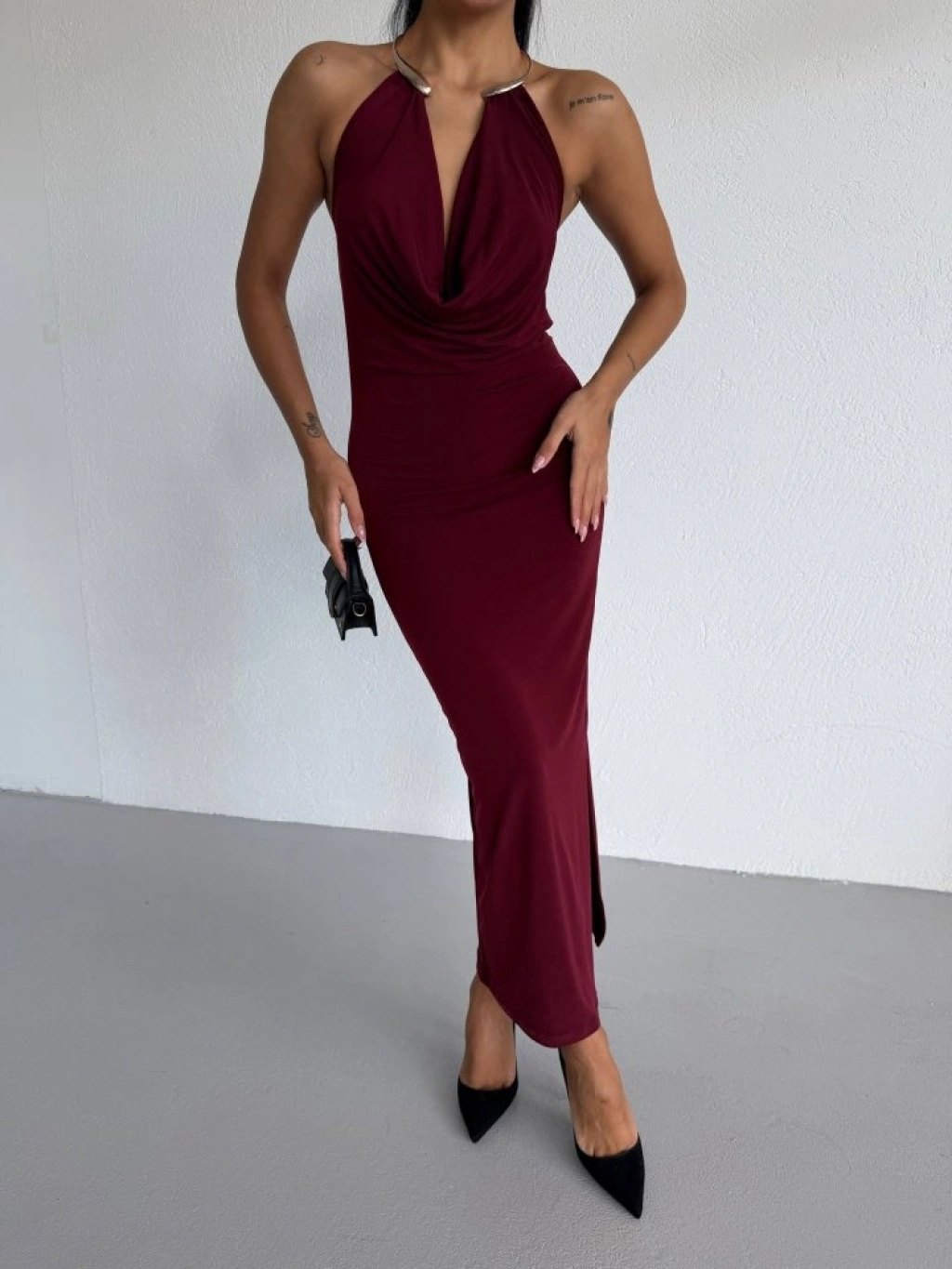 Kadın Boyun Aksesuarlı Halter Yaka Maxi Boy Sandy Kumaş Elbise