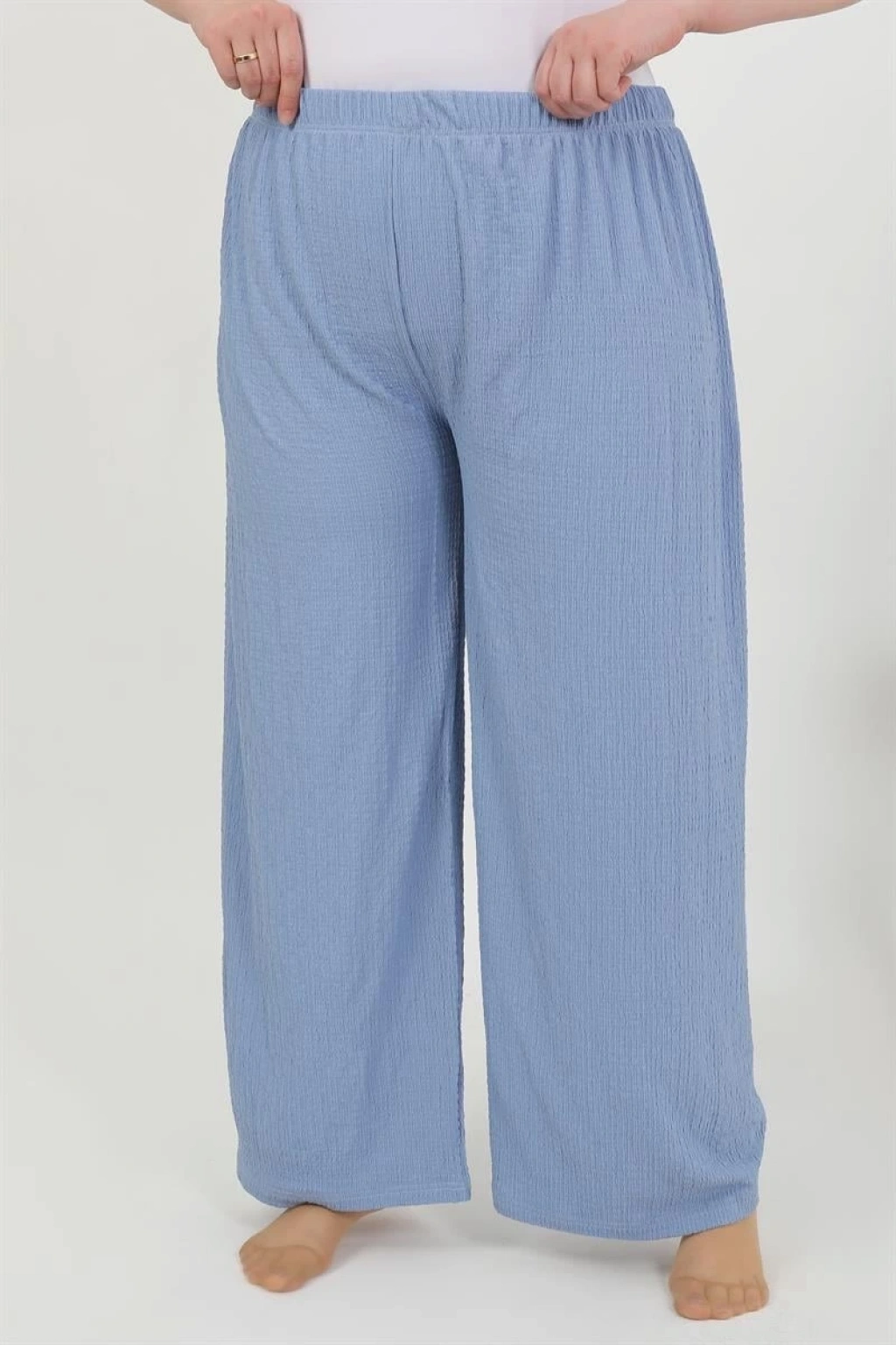 Çamaşır Kenti markasının tasarladığı Kadın Büyük Beden Bürümcük Pantolon Mavi rengiyle şıklığınızı tamamlayacak bir parça olarak gardırobunuzda yer almalı. Farklı beden seçenekleriyle her bedene uygun olan bu pantolon, konforlu kumaşıyla da dikkat çekiyor.