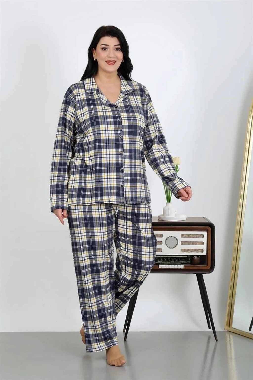 MARSiLYAN- Kadın Büyük Beden Pamuklu Cepli Düğmeli Lacivert Pijama Takım