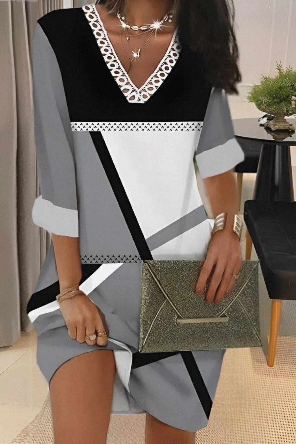 Kadın Fakir Kollu V Dantel Yaka Geometrik Desenli Dalgıç Elbise