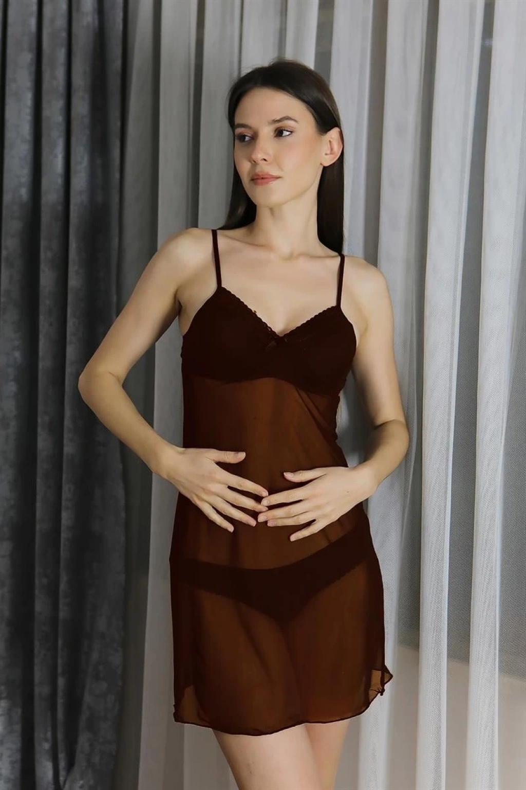 Çamaşır Kenti'nin özel tasarımı olan Kadın Fantezi Tül Gecelik Kahve ile geceye şıklık katmaya hazır olun! İnce tül kumaşı ve dantel detaylarıyla romantizmi ve zarifliği bir arada sunan bu gecelik, kendinizi özel ve çekici hissetmenizi sağlayacak. Vücudu saran yapısıyla konforlu bir kullanım sunarken, Kahve rengiyle de feminen bir şıklık vurgusu yapar. Gecenin kraliçesi olmak isteyen kadınların tercihi olan bu gecelik, partnerinizi büyülemek için ideal bir seçenektir. Kendinizi özel ve güzel hissetmek için Kadın Fantezi Tül Gecelik Kahve'yi hemen sepetinize ekleyin!%95 Polyester %5 Likra