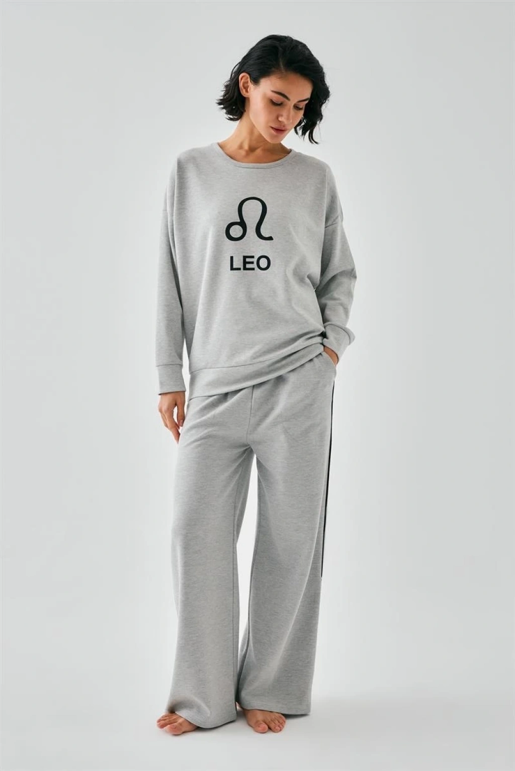 Çamaşır Kenti'nin özel tasarımı olan Kadın Gri Aslan Burcu Oversize 2 İplik Eşofman Ev Giyim Takımı, rahatlığı ve şıklığı bir arada sunuyor.