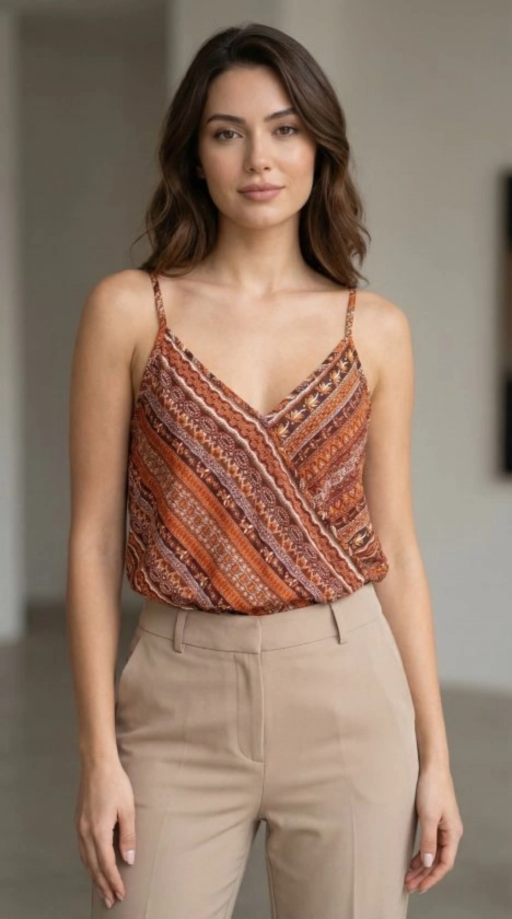 Kadın Ip Askılı V Yakalı Desenli Süprem Bluz