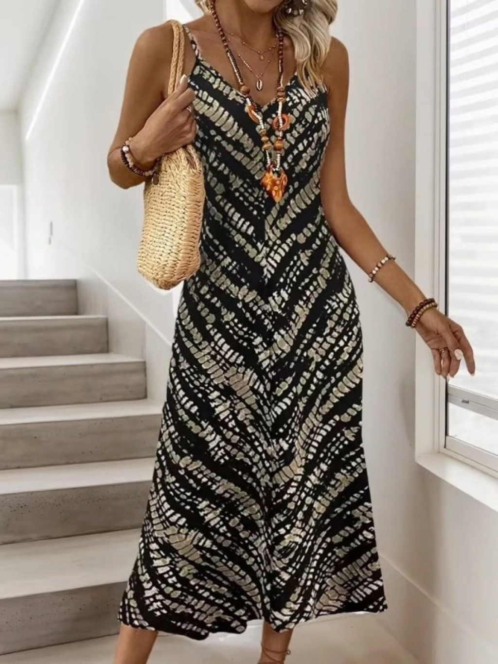 Kadın Ip Askılı V Yakalı Desenli Uzun Süprem Elbise