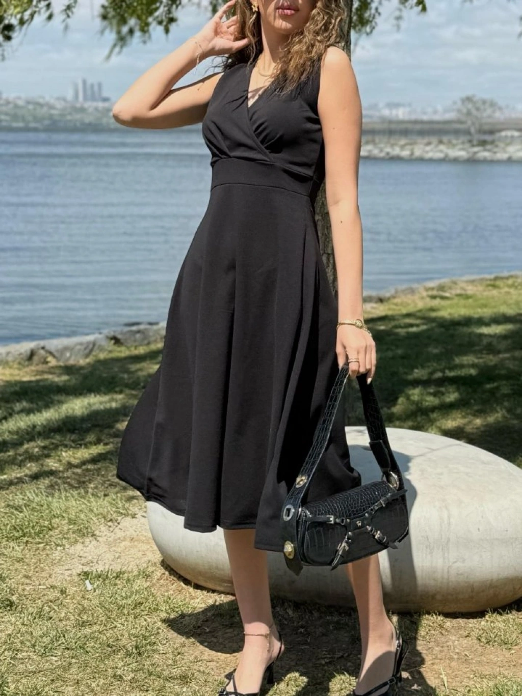 MARSiLYAN- Kadın Ithal Krep Kumaş Kruvaze Yaka Eteği Kloş Kolsuz Mini Elbise