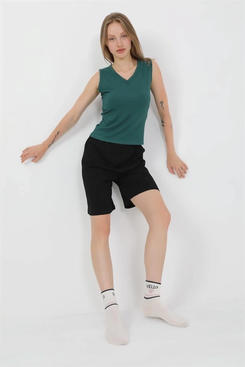 Yüksek kaliteli pamuk penye malzemeden üretilen üst kısmı, kalın askıları ile hem modern hem de şık bir görünüm sunuyor. Üst kısmın uyumlu olduğu kısa şort ise rahat kesimi ve kalın kumaşıyla gün boyu konfor sağlıyor.