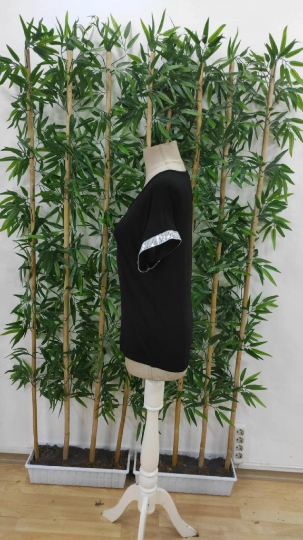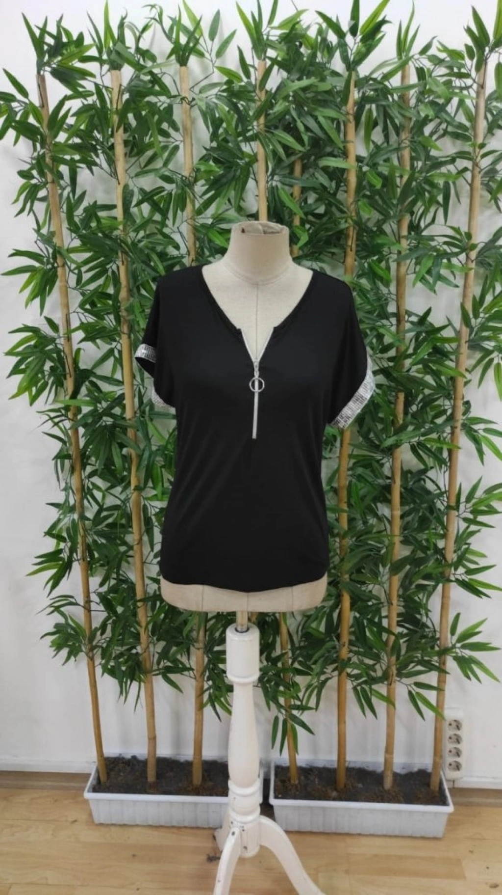 Kadın Kısa Kollu önden Fermuarlı Kol Ucu ışıltılı Viskon Bluz