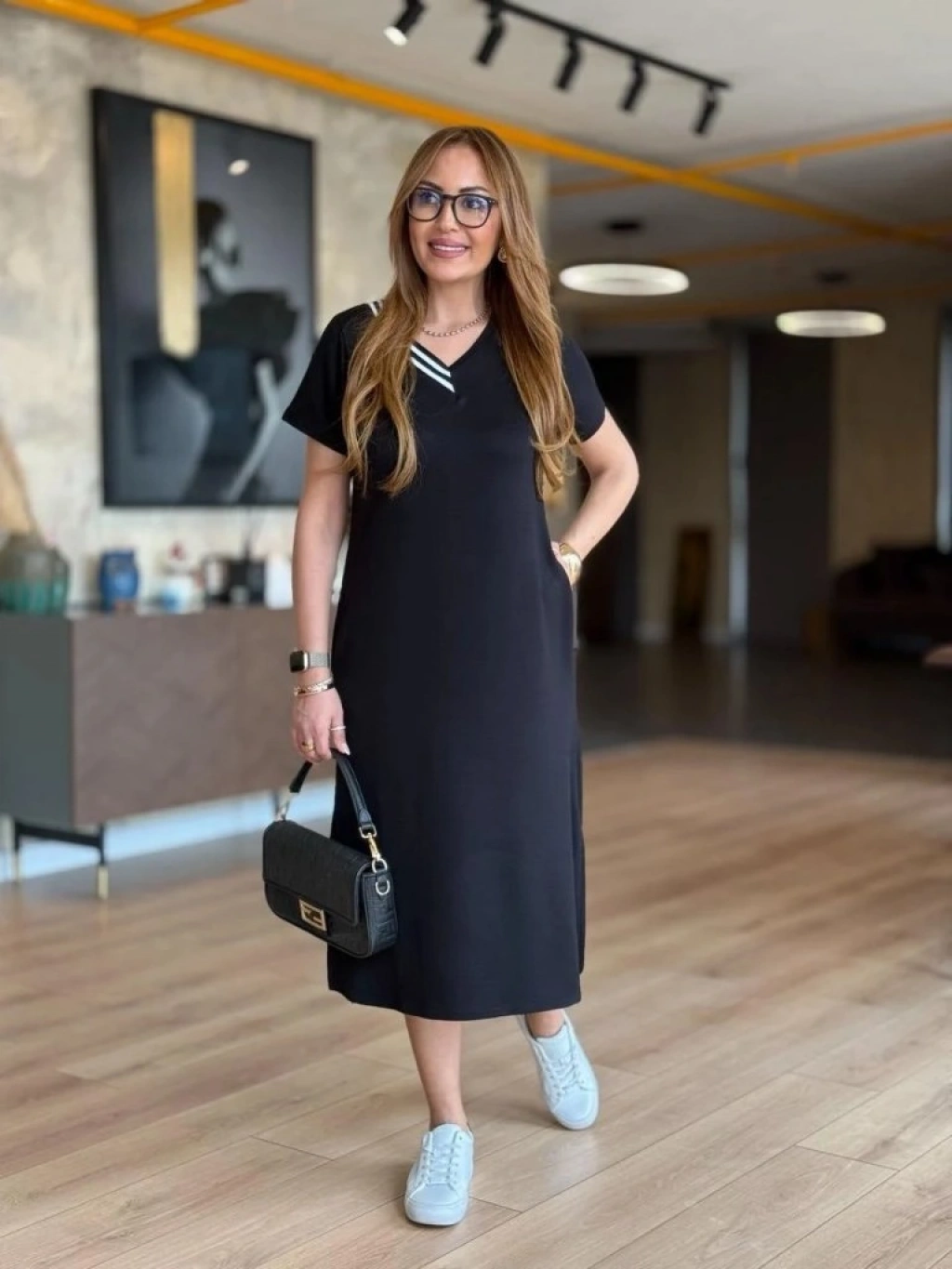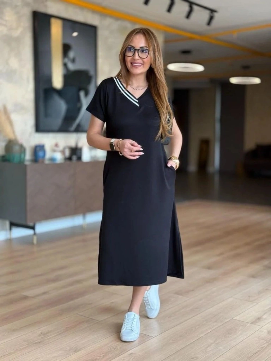 Kadın Kısa Kollu V Ribana Yakalı Yırtmaçlı Midi Viskon Iki Iplik Elbise