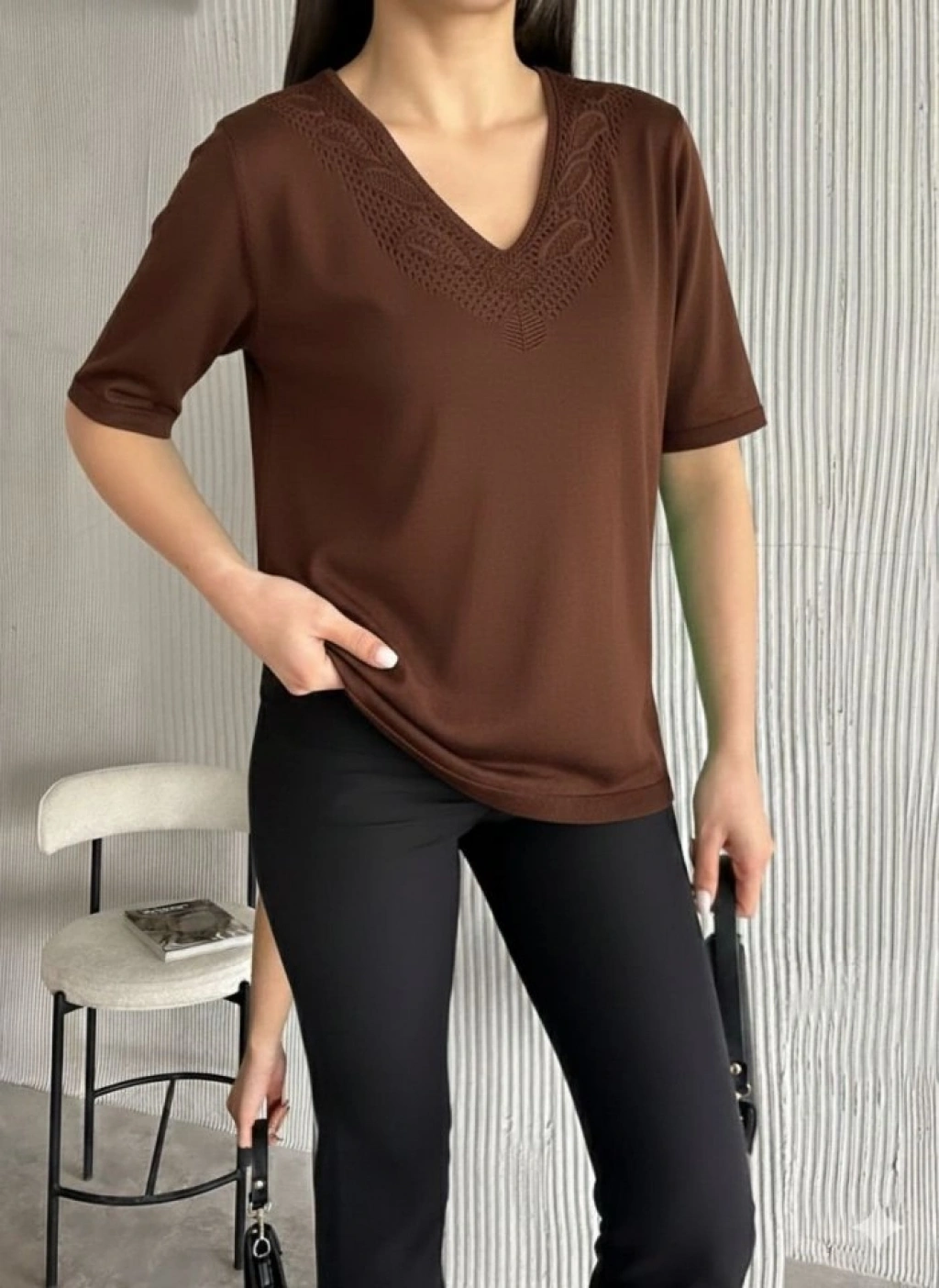 Kadın Kısa Kollu V Yaka Ajurlu Triko BluZ