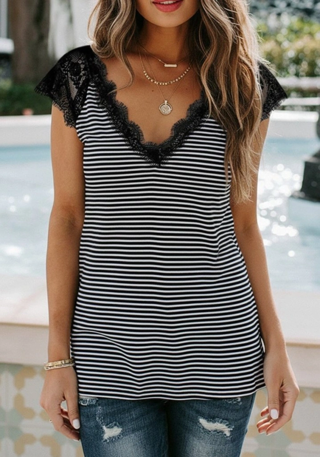 Kadın Kısa Kollu V Yakalı Dantelli Süprem Bluz