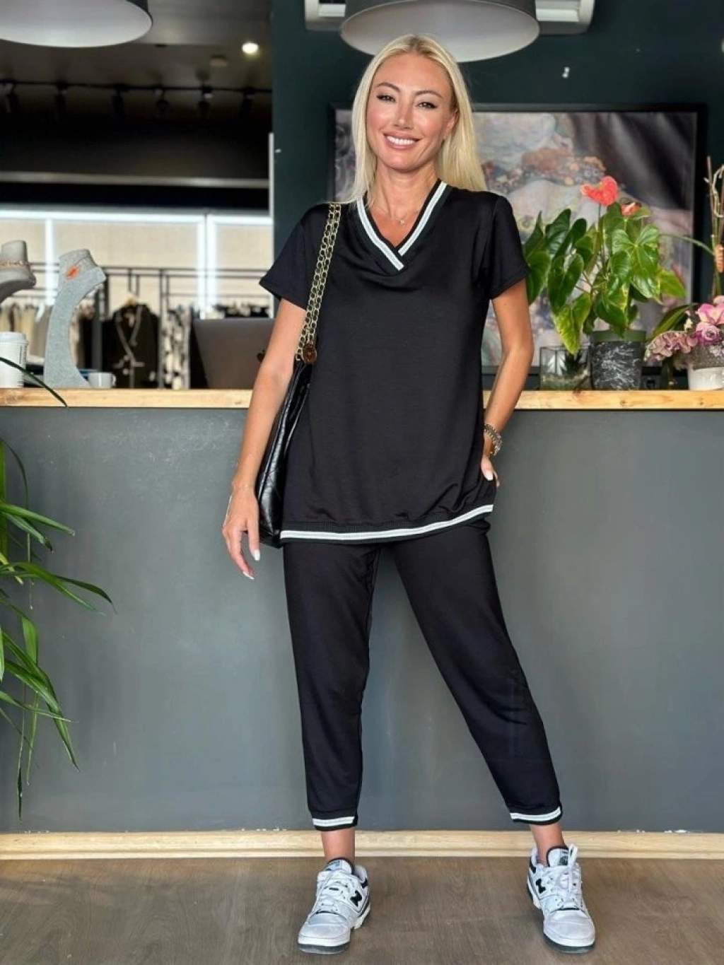 Kadın Kısa Kollu V Yakalı Iki Iplik Bluz Ve Pantolon Ikili Takım