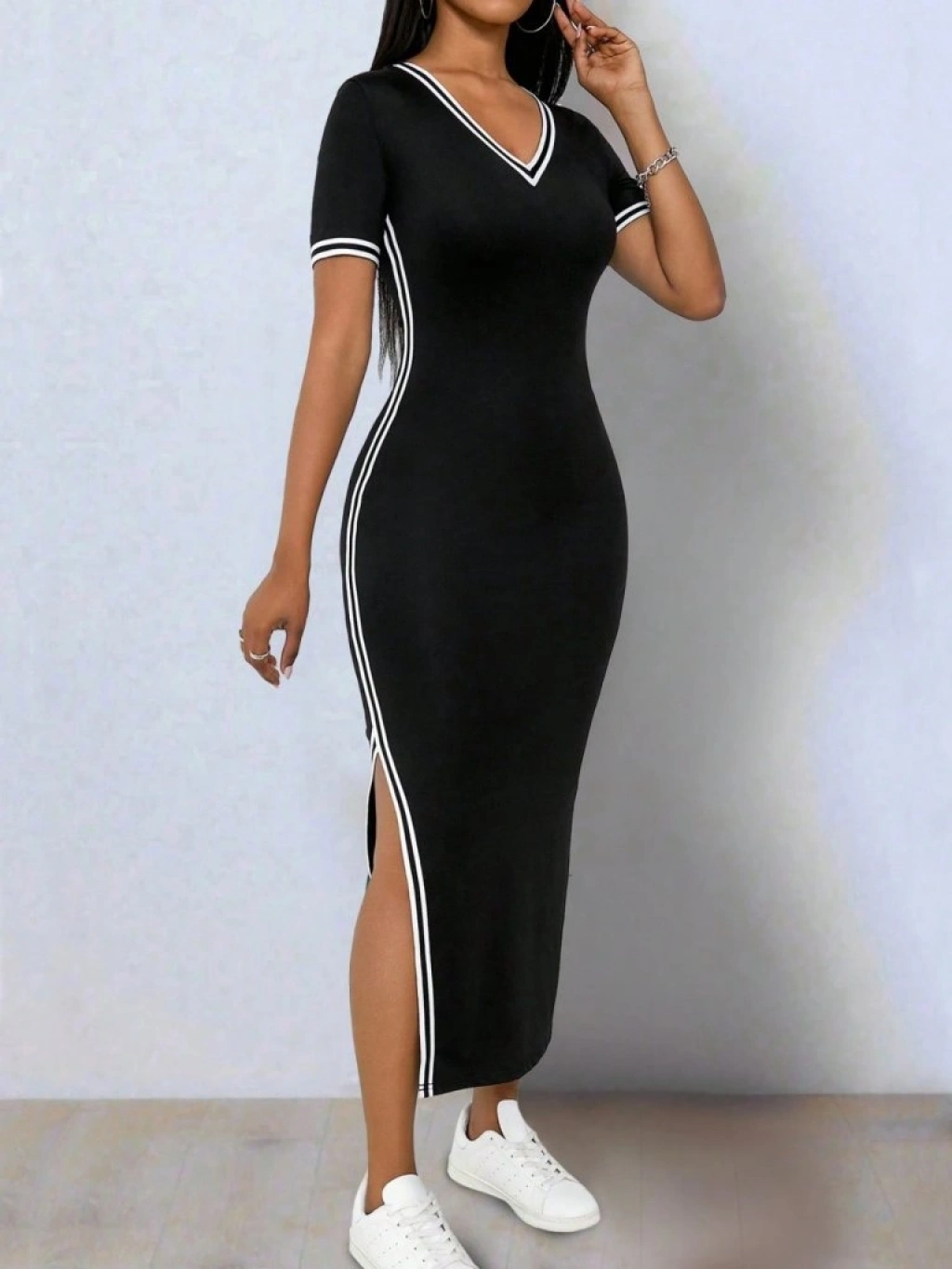 Kadın Kısa Kollu V Yakalı Yandan Yırtmaçlı Viskon Iki Iplik Elbise