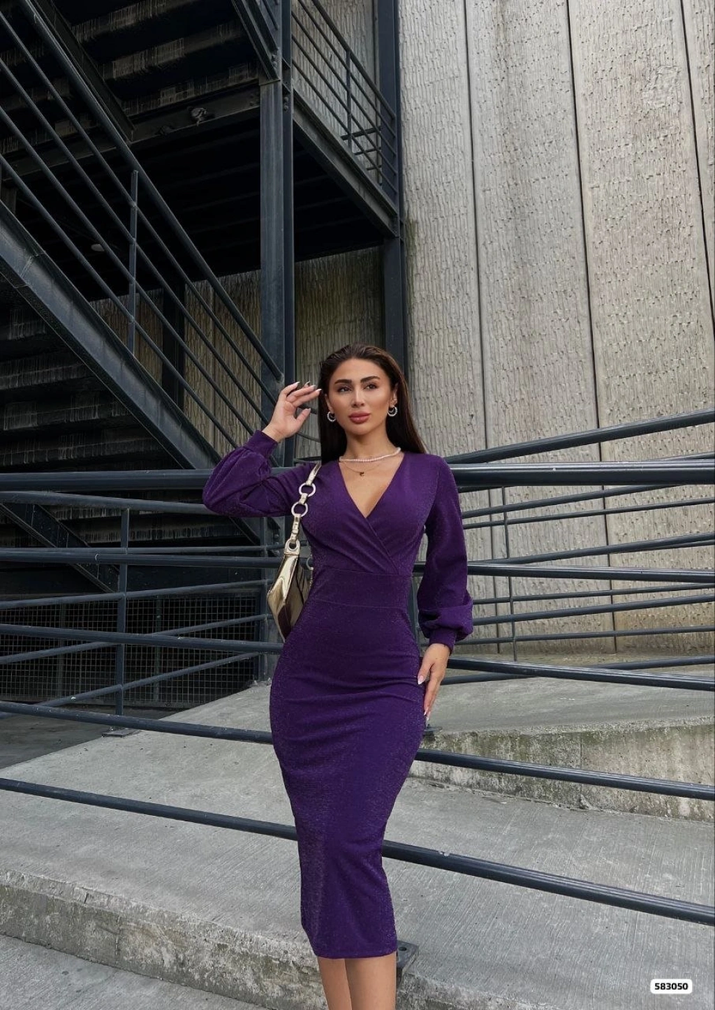 Kadın Kruvaze Yaka Balon Kol Simli Krep Kumaş Midi Boy Elbise