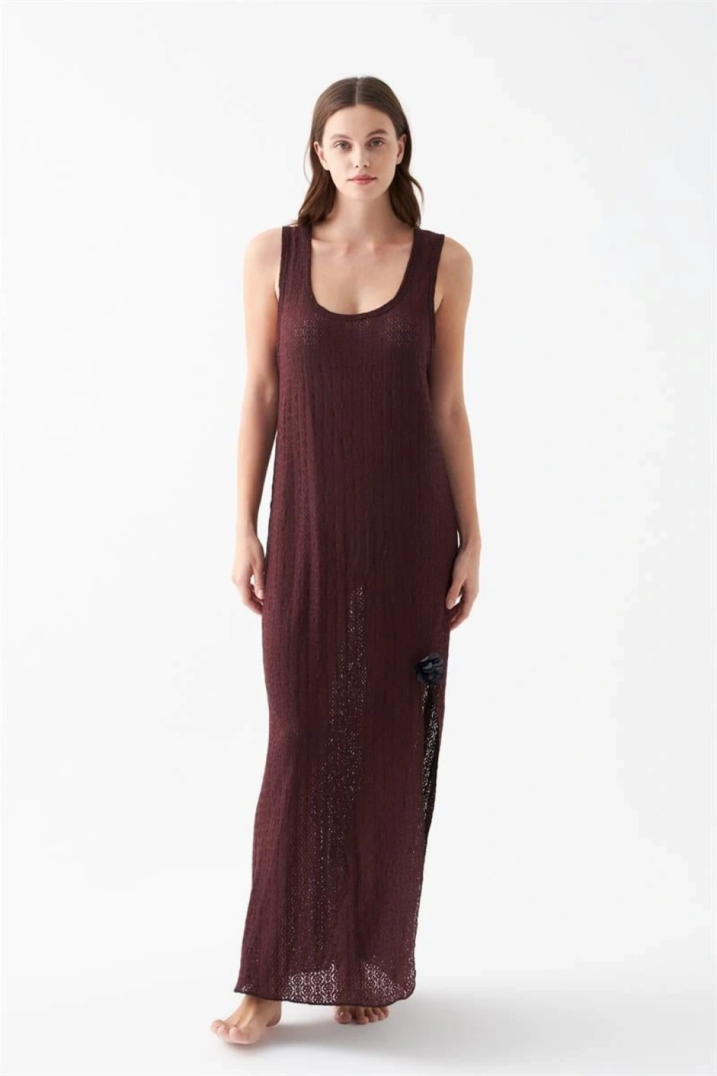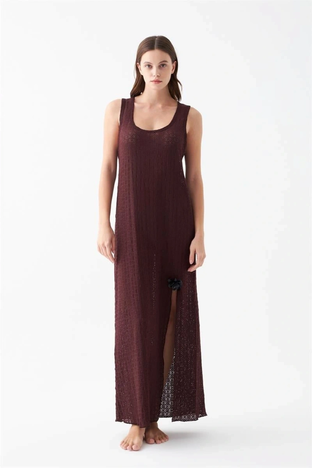 MARSiLYAN- Kadın Mürdüm Dantel Dokulu Yırtmaçlı Uzun Gecelik – Zarif ve Rahat Uyku Geceliği