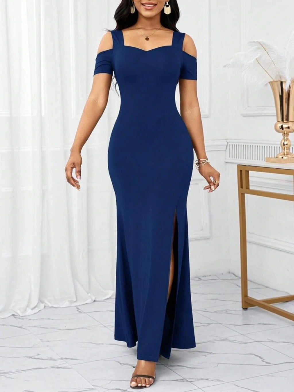 Kadın Omuzlardan Açık Askılı Yırtmaç Detaylı Uzun Ithal Krep Elbise