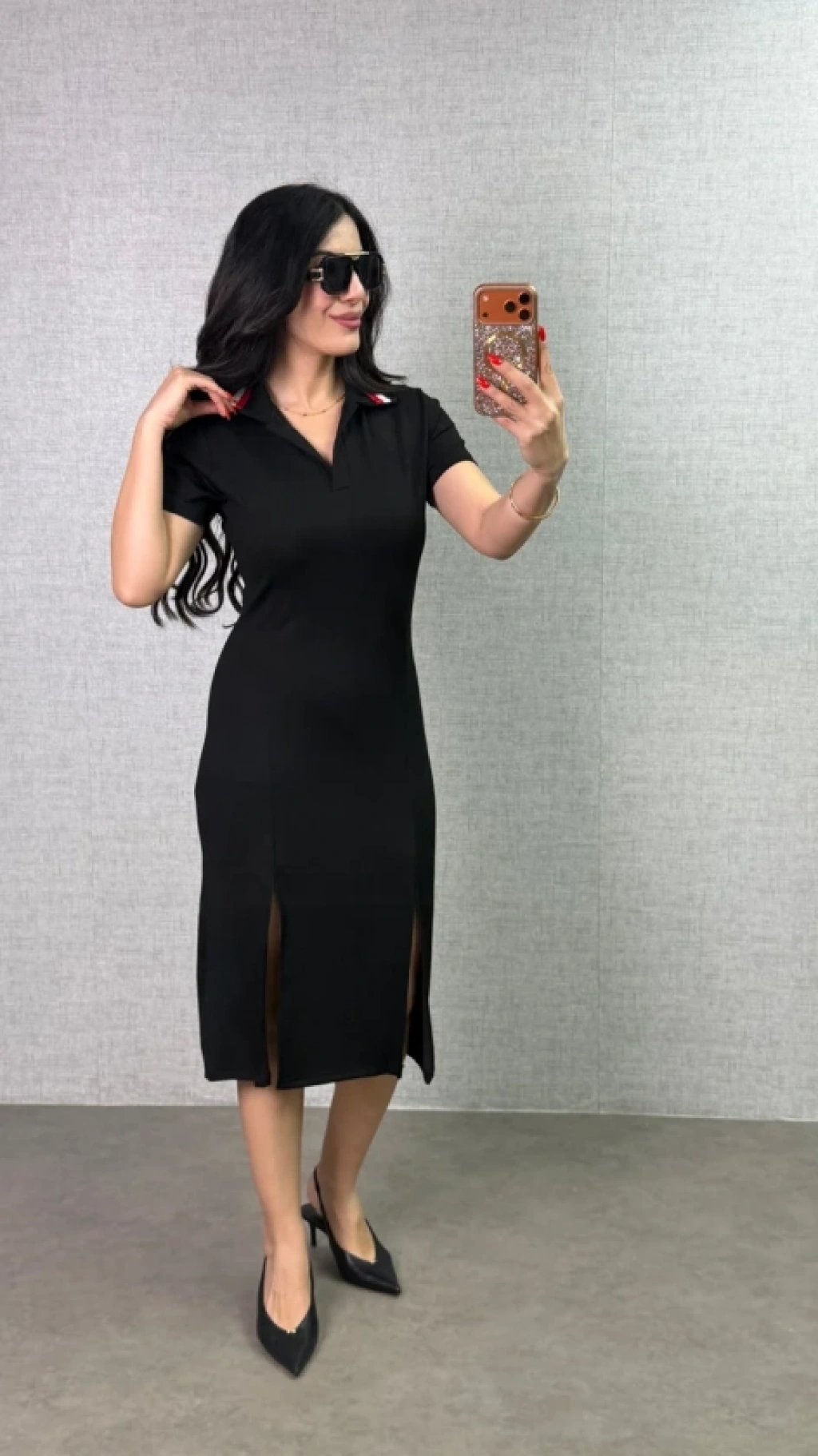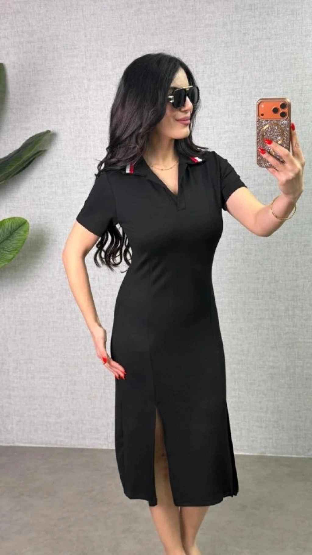 Kadın Polo Yaka çift Yırtmaç Detay Modal Kumaş Midi Boy Elbise