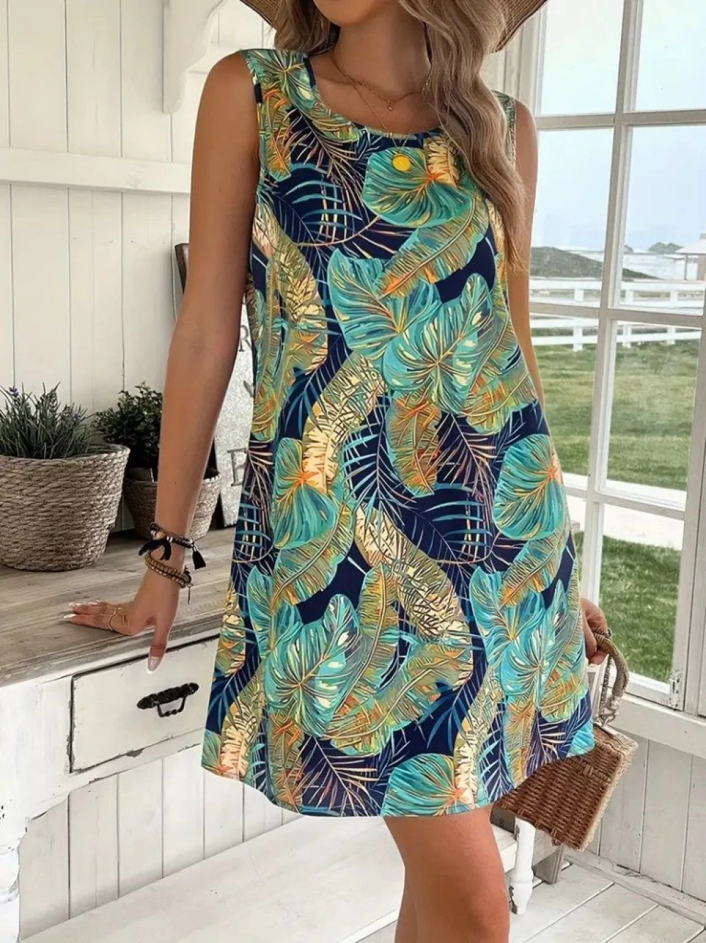 Kadın Sıfır Kollu Yuvarlak Yaka Desenli Süprem Elbise