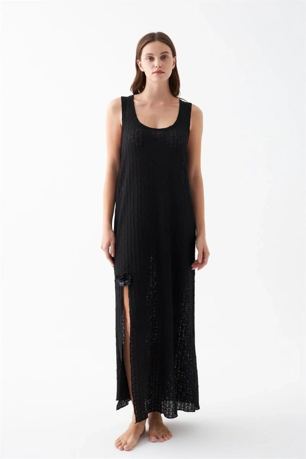 MARSiLYAN- Kadın Siyah Dantel Dokulu Yırtmaçlı Uzun Gecelik – Zarif ve Rahat Uyku Geceliği