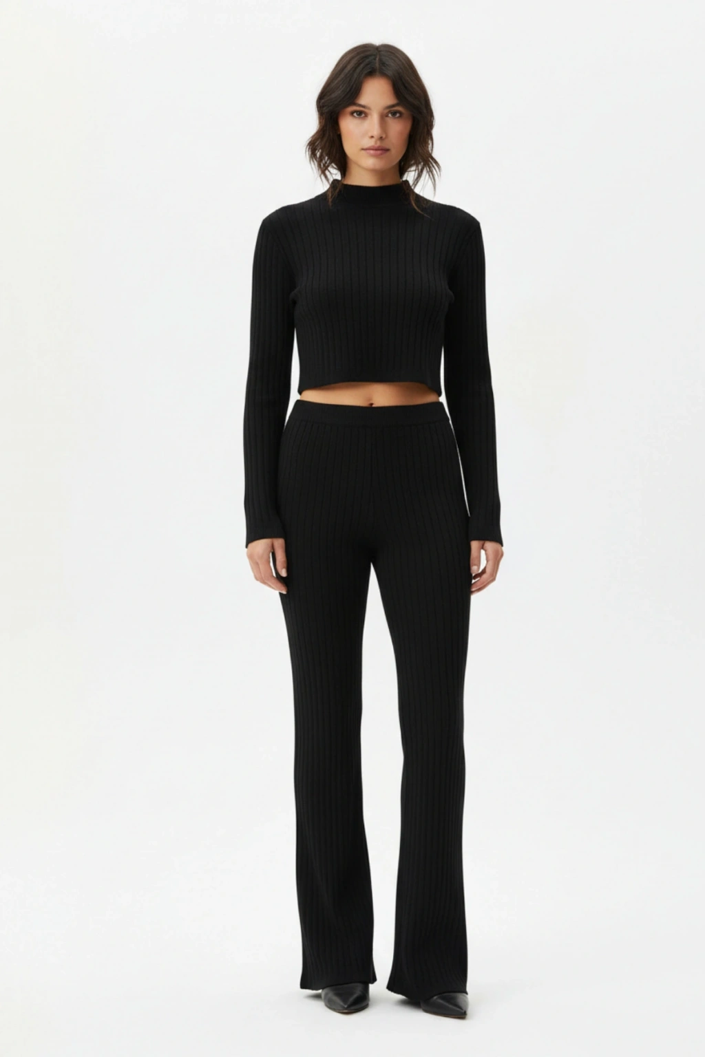 • Uzun kollu crop üst, modern bir siluet oluştururken pantolonun düz paça kesimi vücuda dengeli bir görünüm kazandırır.