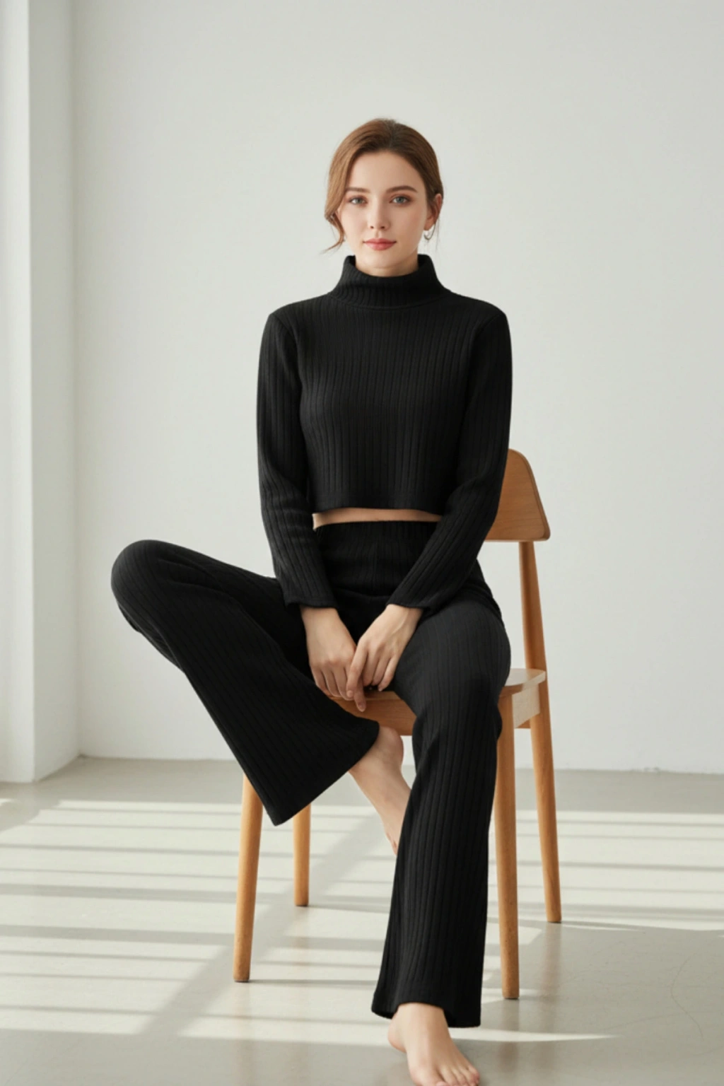 MARSiLYAN- Kadın Siyah Fitilli Eşofman Takımı – Crop Uzun Kollu Üst & Paça Pantolon, Şık Günlük Set
