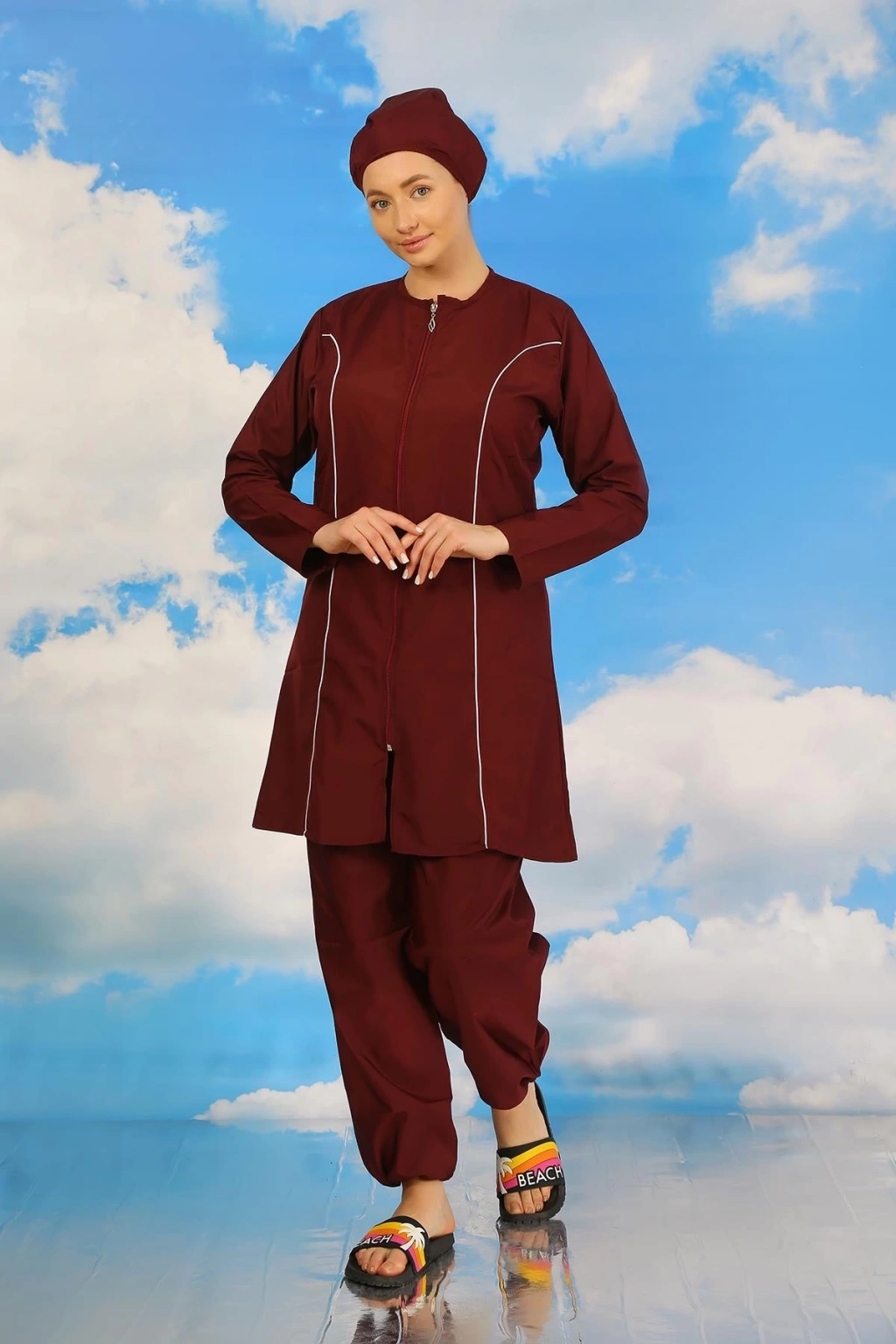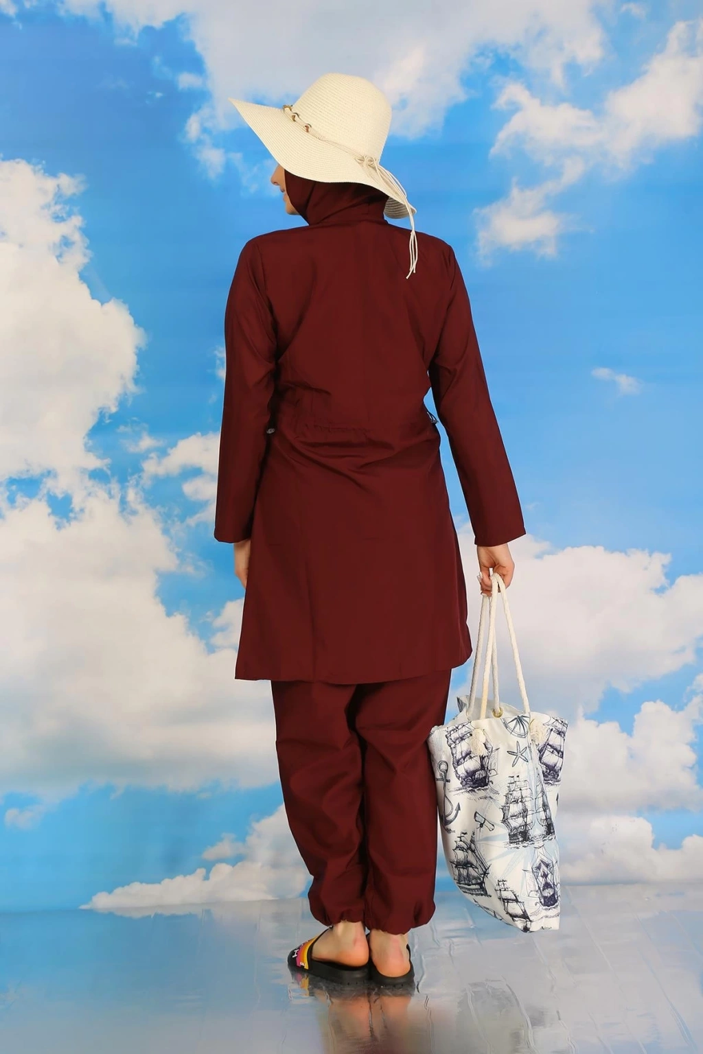 Çamaşır Kenti markasının kadınlar için özel olarak tasarladığı Tam Tesettür Bordo Mayo, plajda şıklığı ve rahatlığı bir arada arayanların tercihi olacak. Ürün, tesettüre uygun kesimiyle dikkat çekerken, Bordo rengi ile de şıklığı ön plana çıkarıyor.