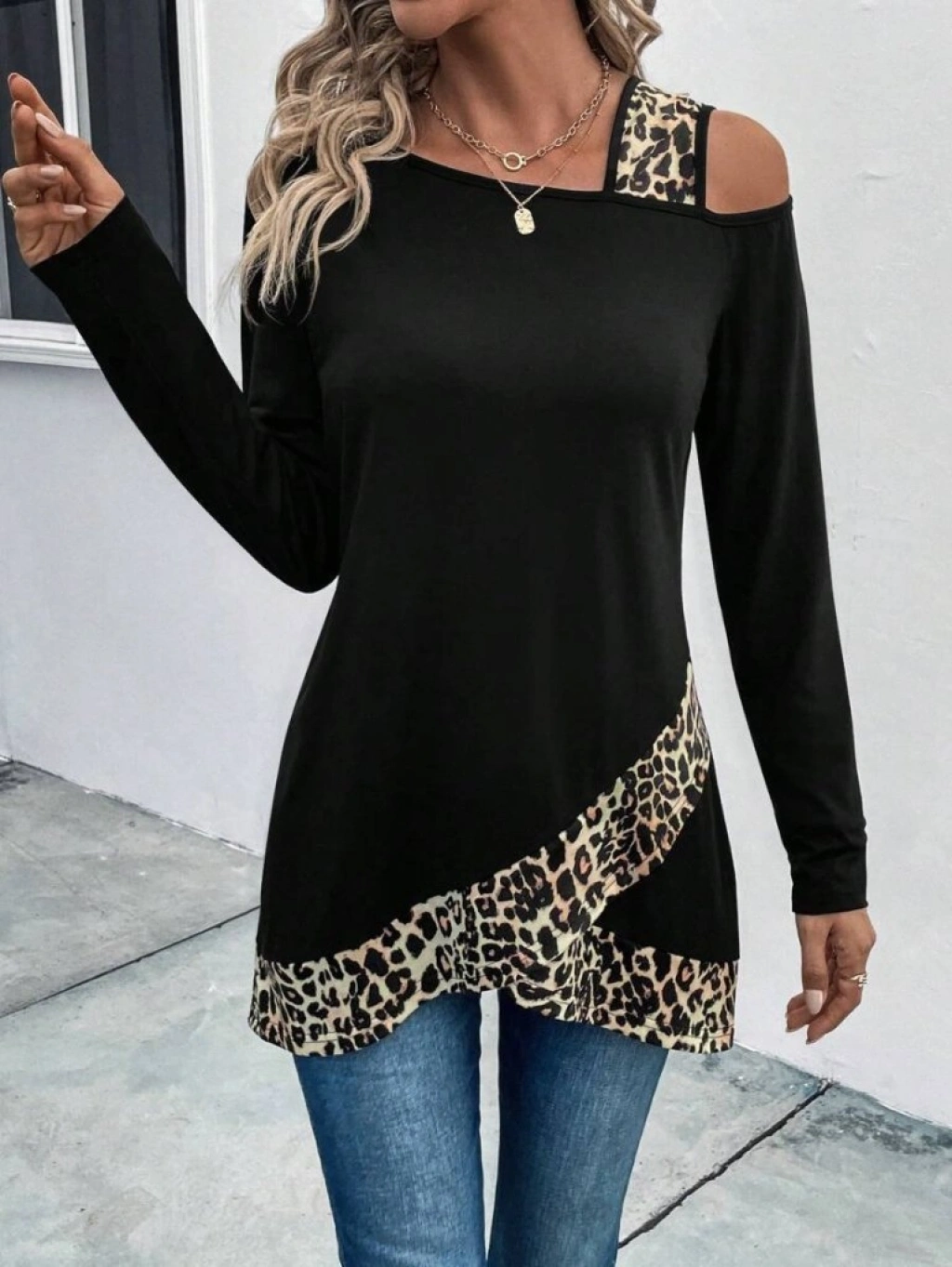 Kadın Tek O Uzdan Açık Askılı Uzun Kollu Leopar Detaylı Viskon Bluz