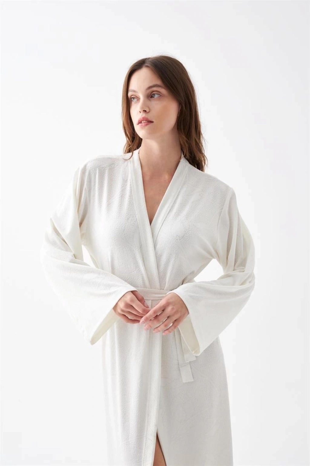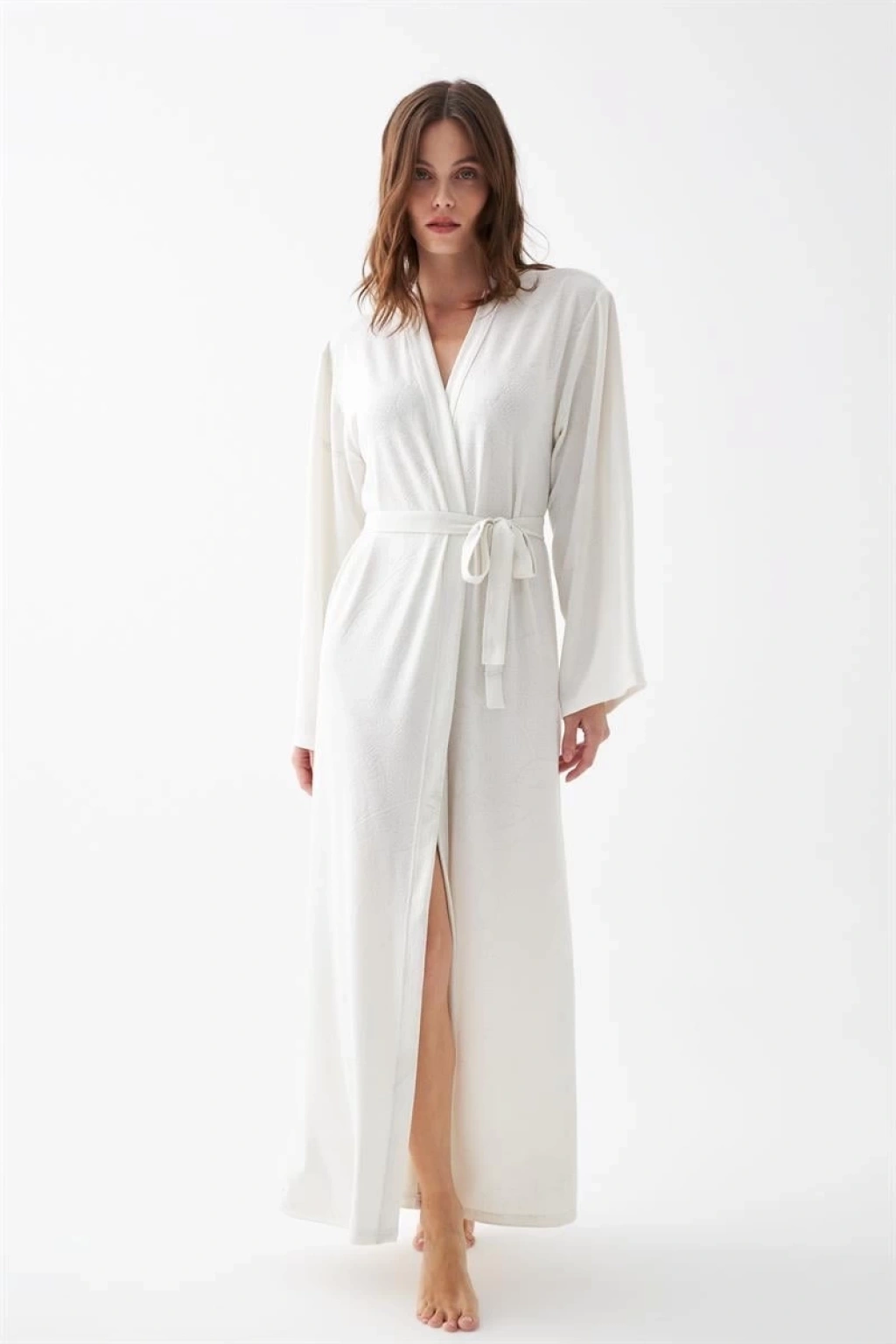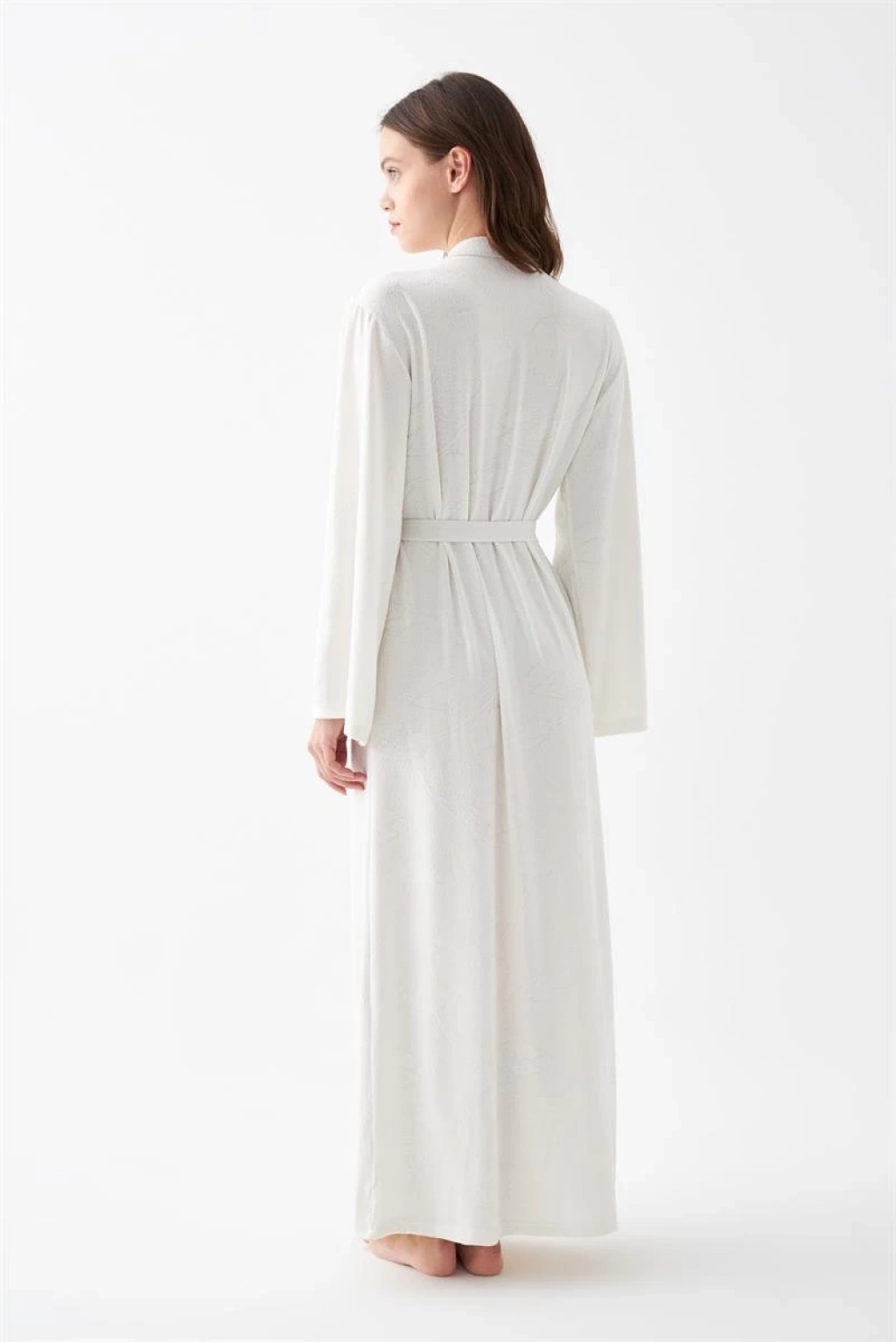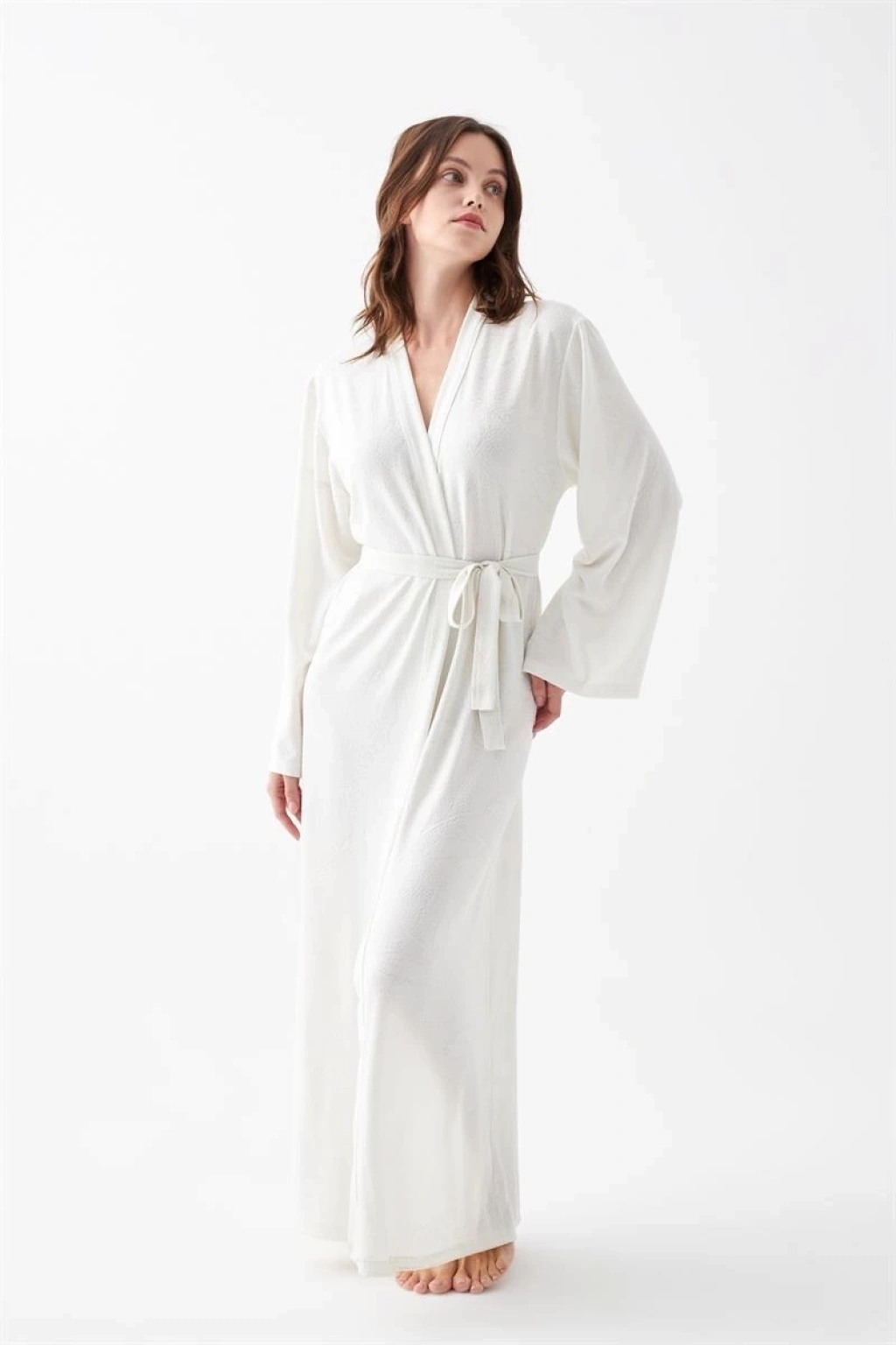 Şıklığı ve konforu bir arada arayan kadınların tercihi olan Çamaşır Kenti Kadın Uzun Ekru Penye Sabahlık, güzel ve rahat bir gece keyfi sunar.