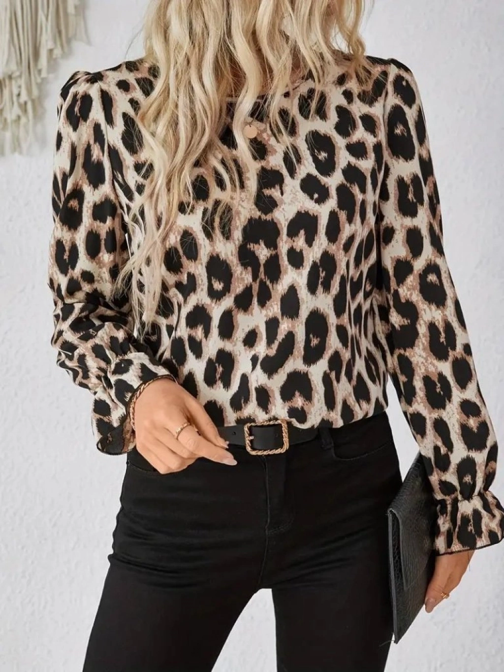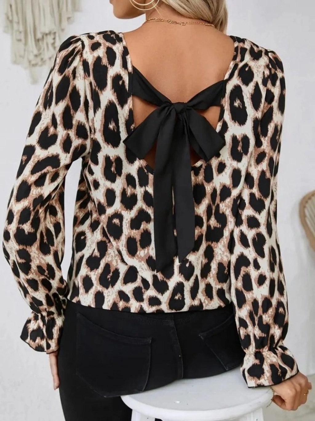 Kadın Uzun Kollu Arkadan Fiyonk Detaylı Leopar Desenli Süprem Bluz