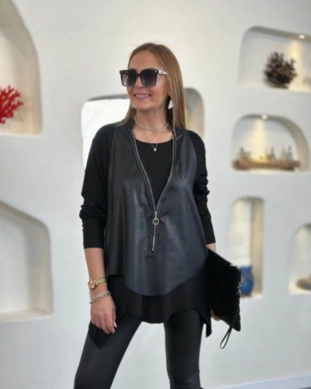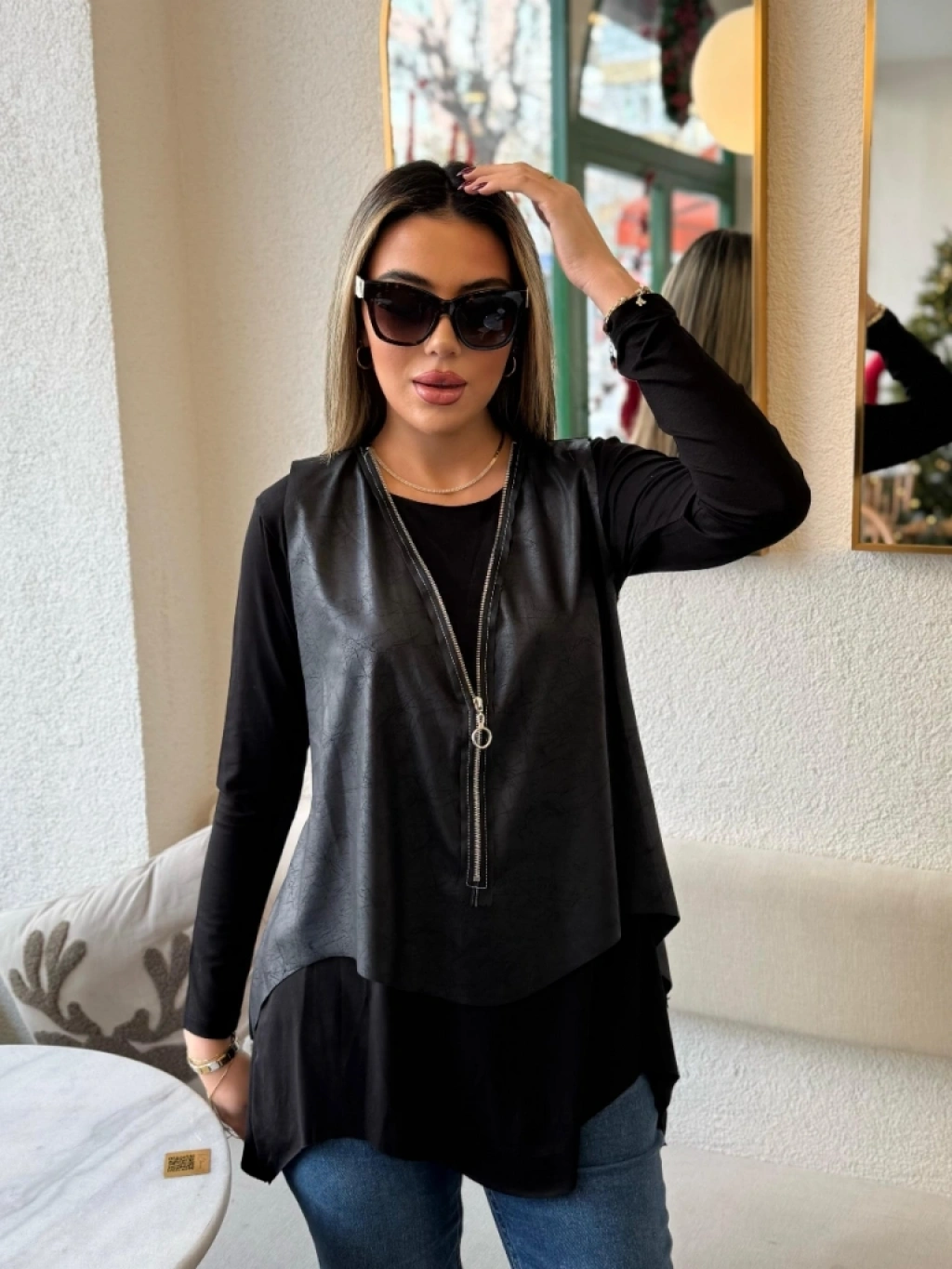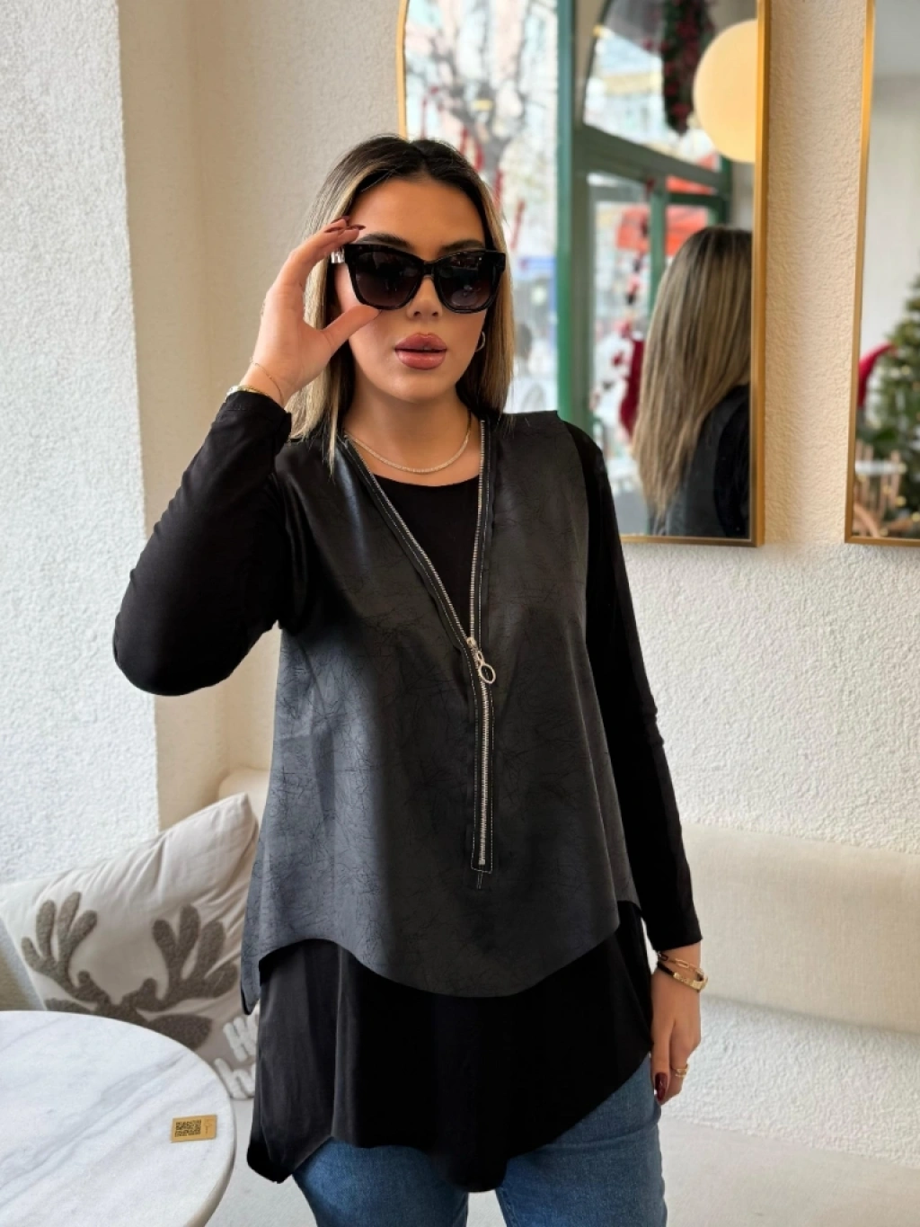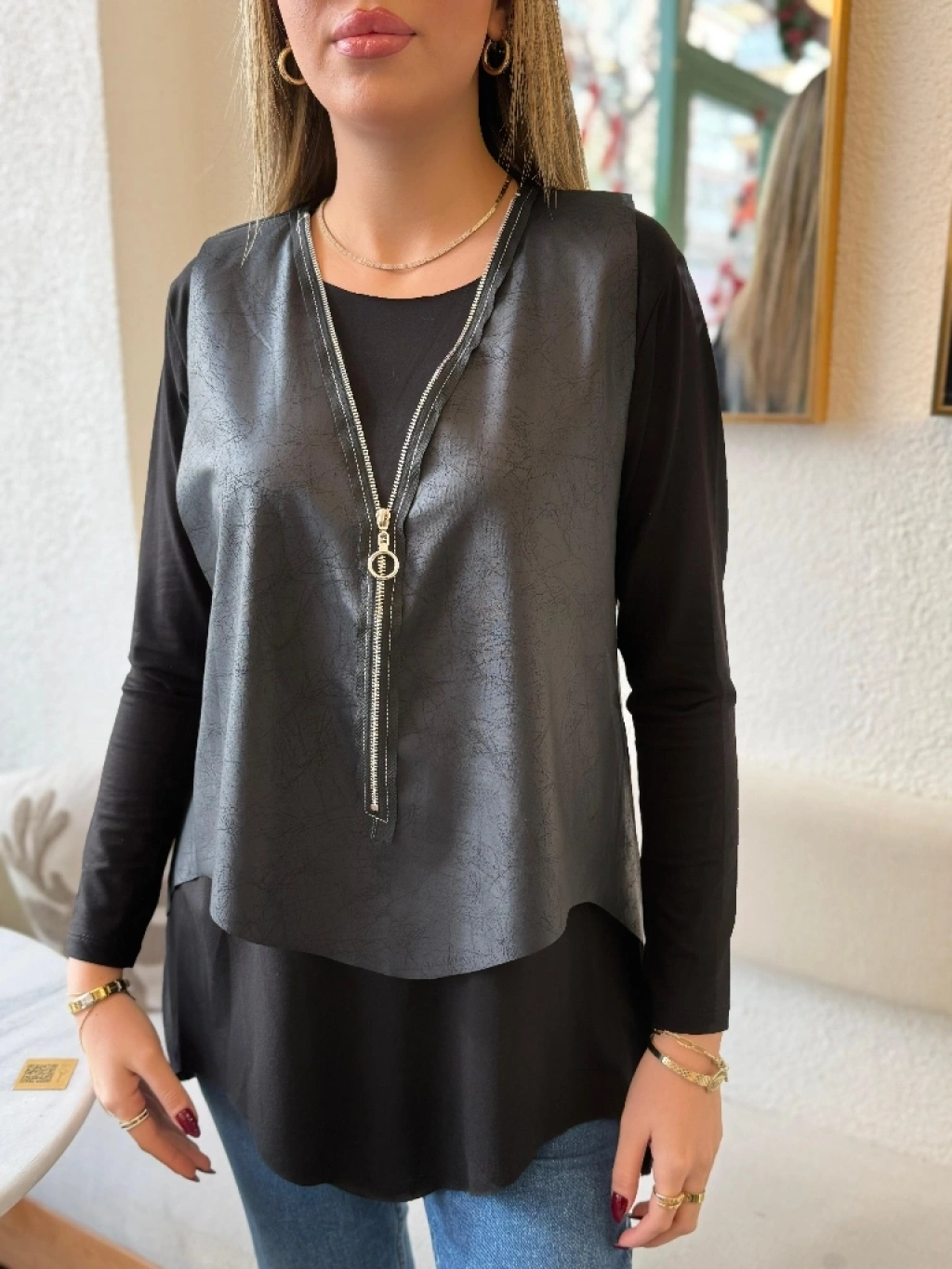 MARSiLYAN- Kadın Uzun Kollu Asimetrik Kesim Viskon Bluz Ve çatlak Deri Görünümlü Yelek Ikili Takım