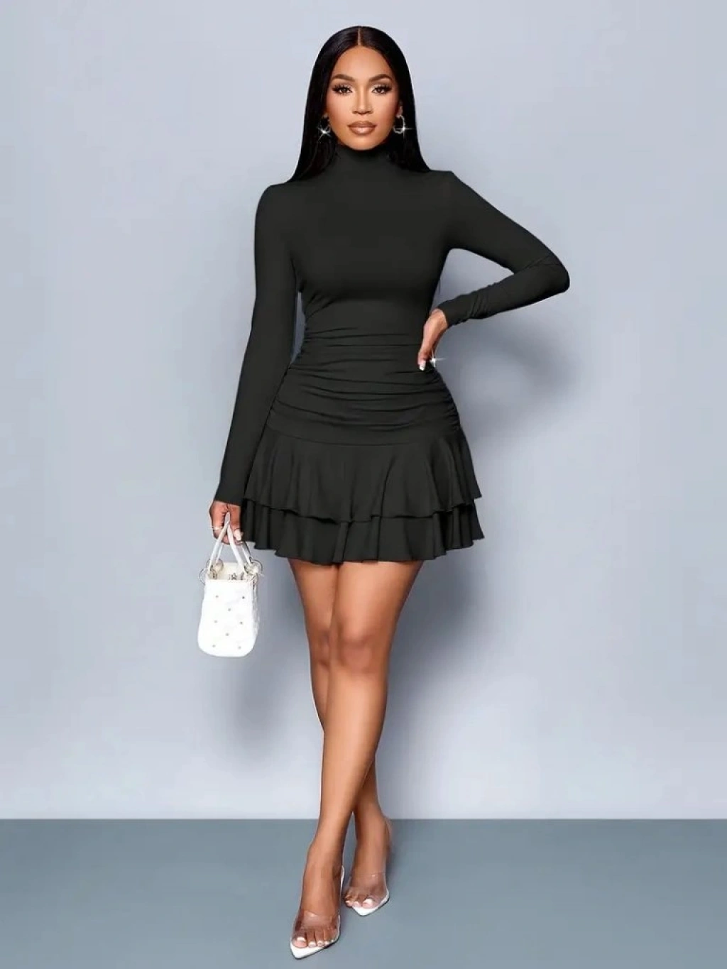 Kadın Uzun Kollu Balıkçı Yaka Mini Fırfırlı Sandy Elbise
