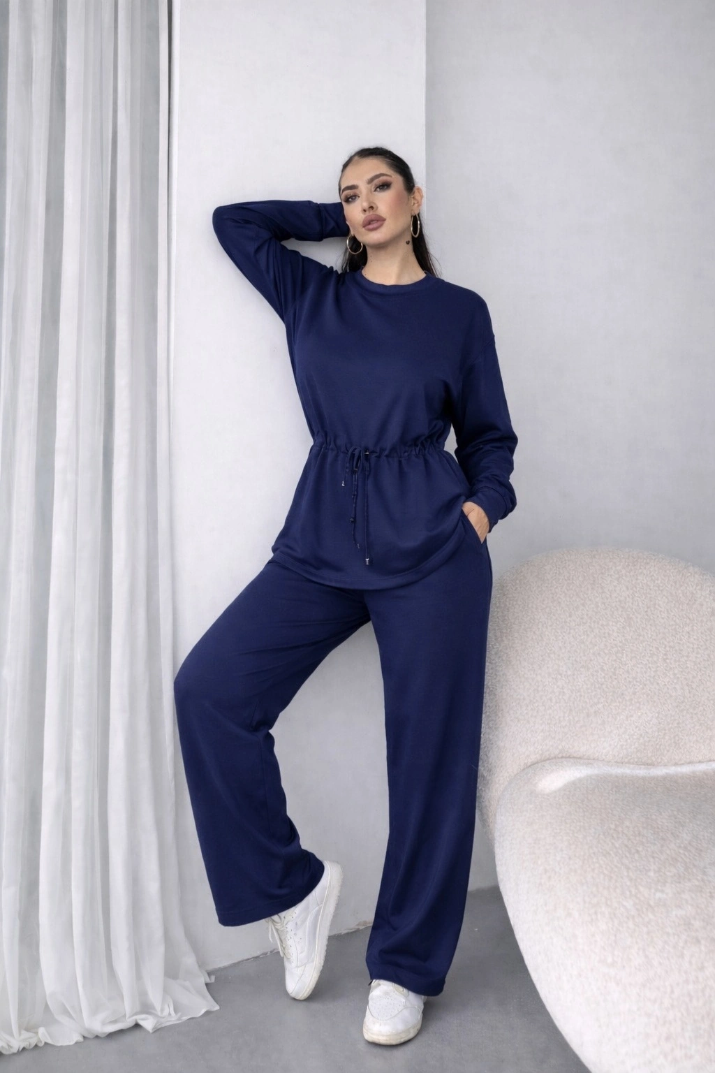 Kadın Uzun Kollu Bisiklet Yaka Belden Büzgülü Bağcıklı Viskon Iki Iplik Bluz Ve Pantolon Ikili Takım
