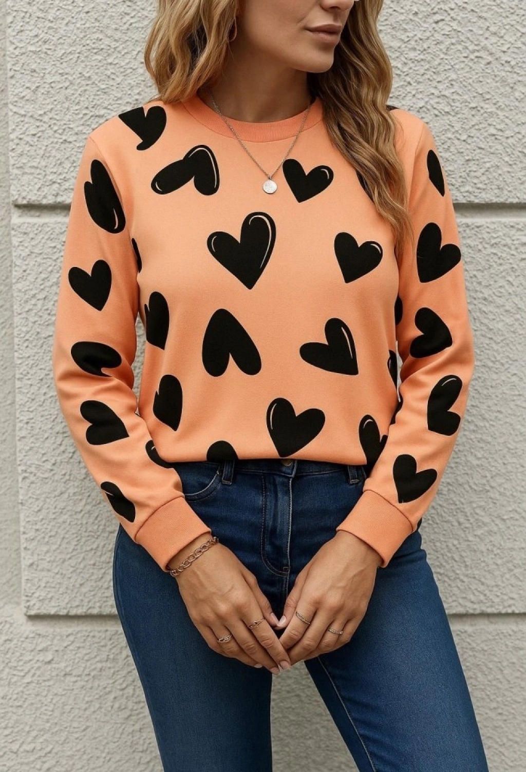 Kadın Uzun Kollu Bisiklet Yaka Kalp Desenli Iki Iplik Bluz