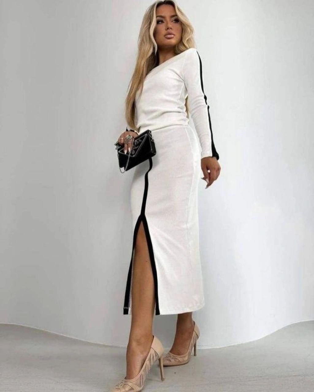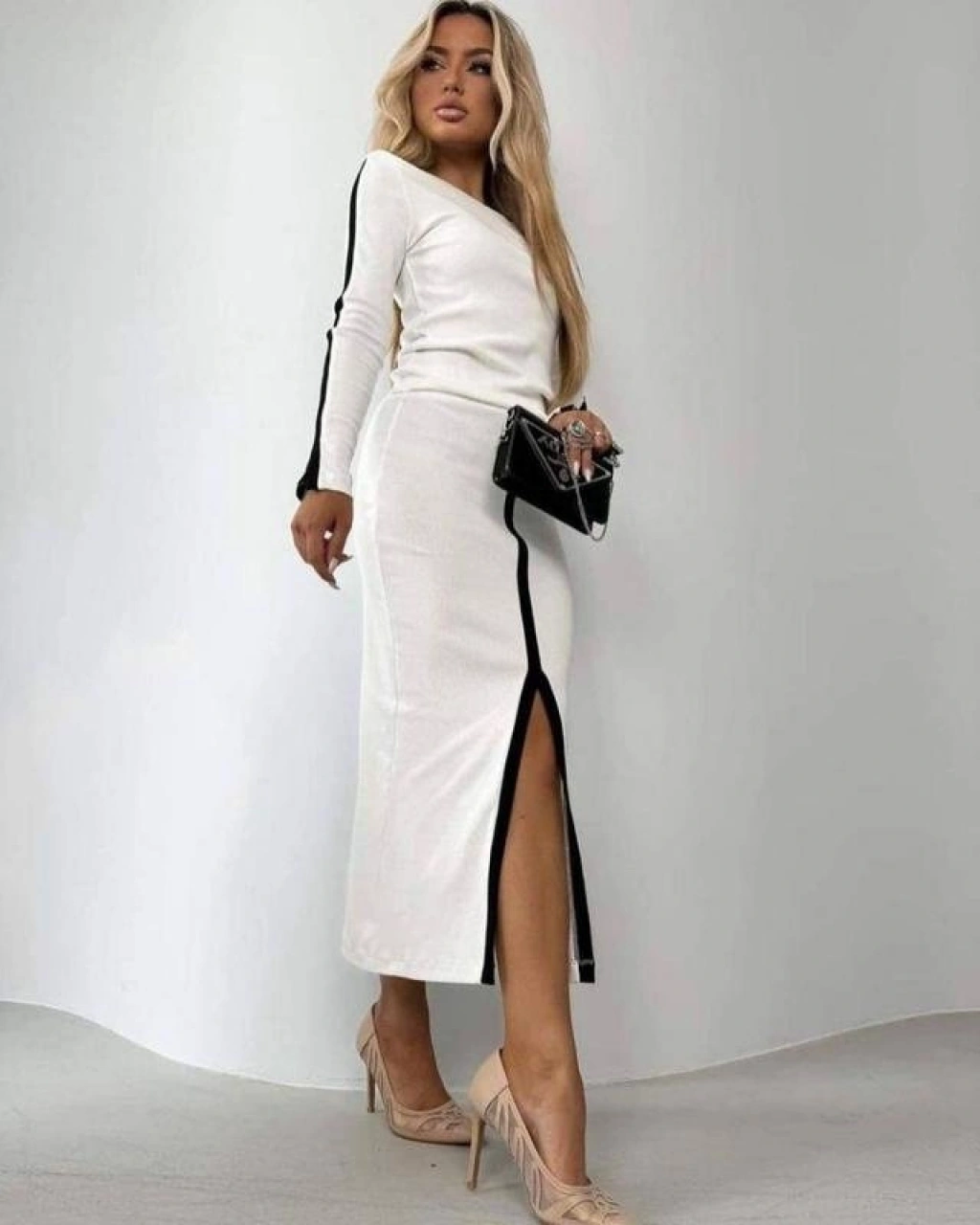 Kadın Uzun Kollu Bisiklet Yaka Kaşkorse Bluz Ve Yırtmaçlı Etek Ikili Takım
