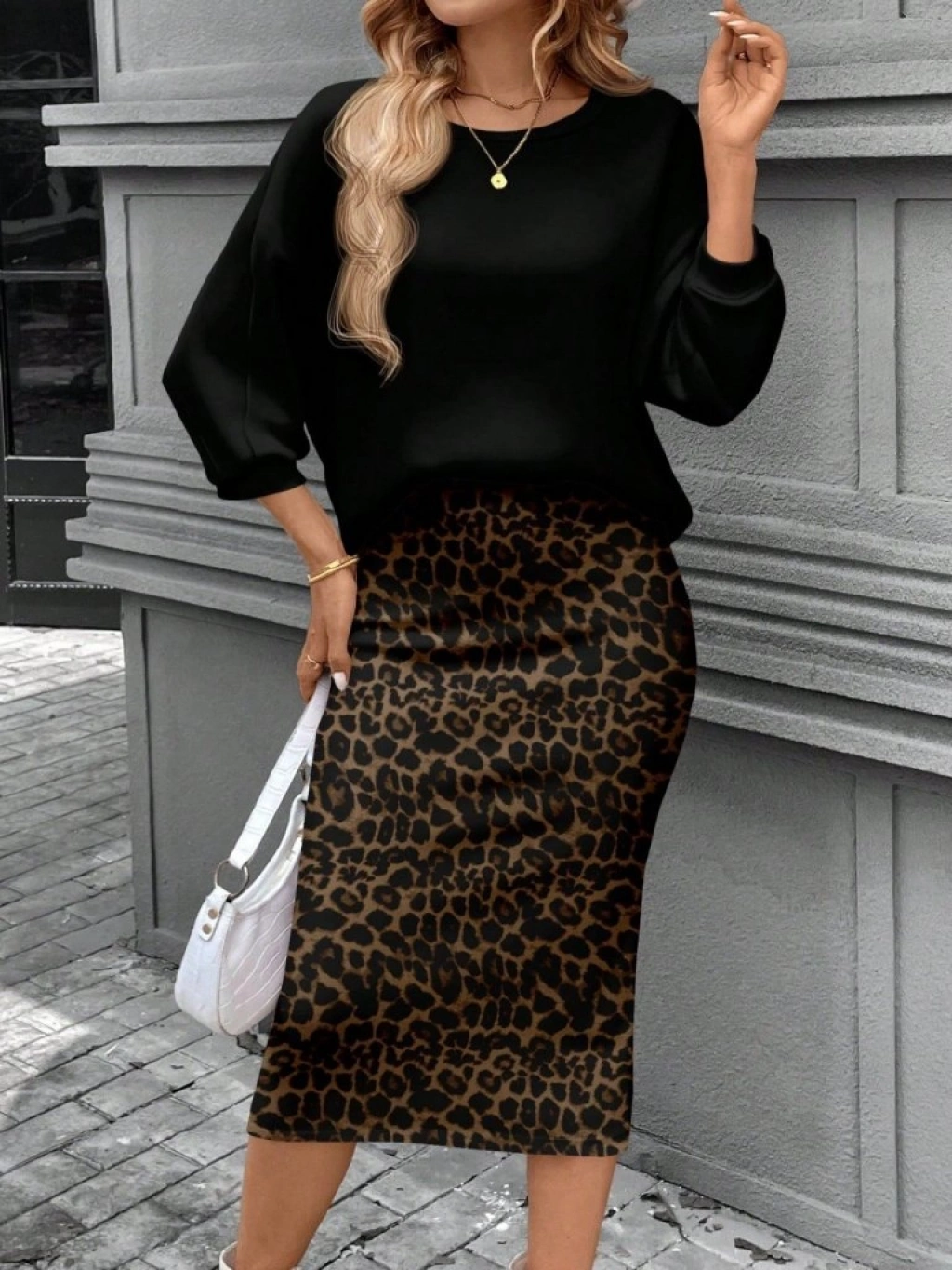 MARSiLYAN- Kadın Uzun Kollu Bisiklet Yaka Modal Bluz Ve Leopar Desenli Etek Ikili Takım