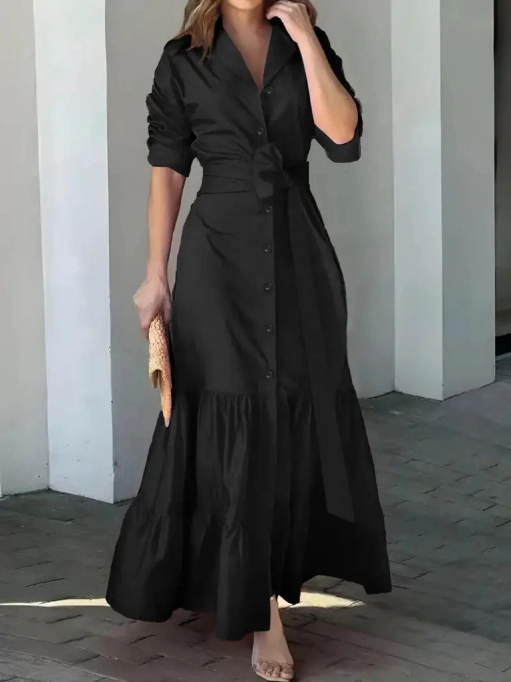 Kadın Uzun Kollu Eteği Fırfırlı Beli Kuşaklı Trikoton Tam Boy Gömlek Elbise
