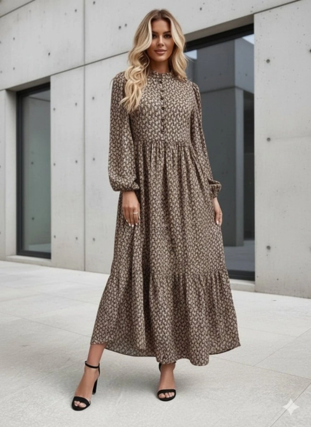 MARSiLYAN- Kadın Uzun Kollu Hakim Yakalı Düğmeli Kemersiz Desenli Maxi Süprem Elbise