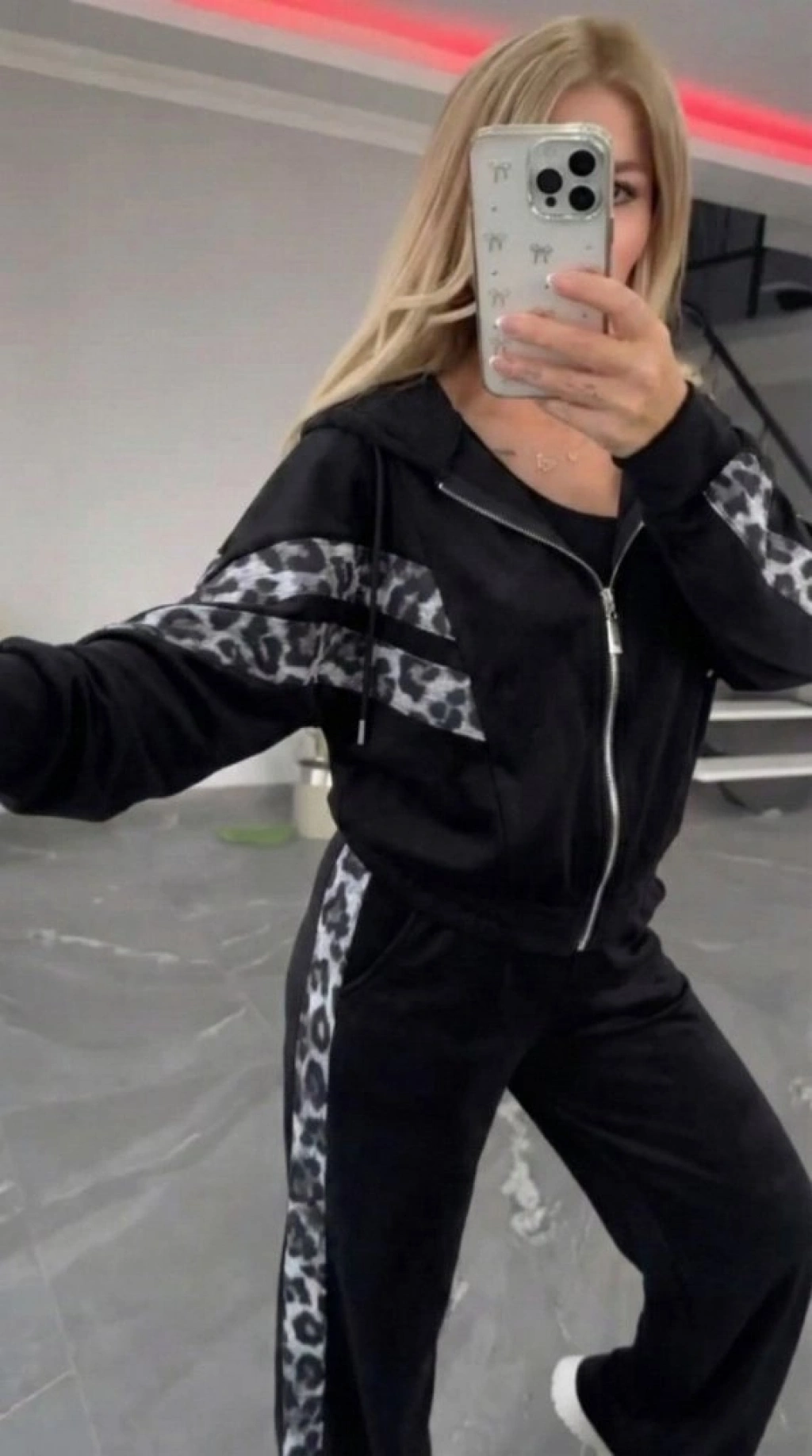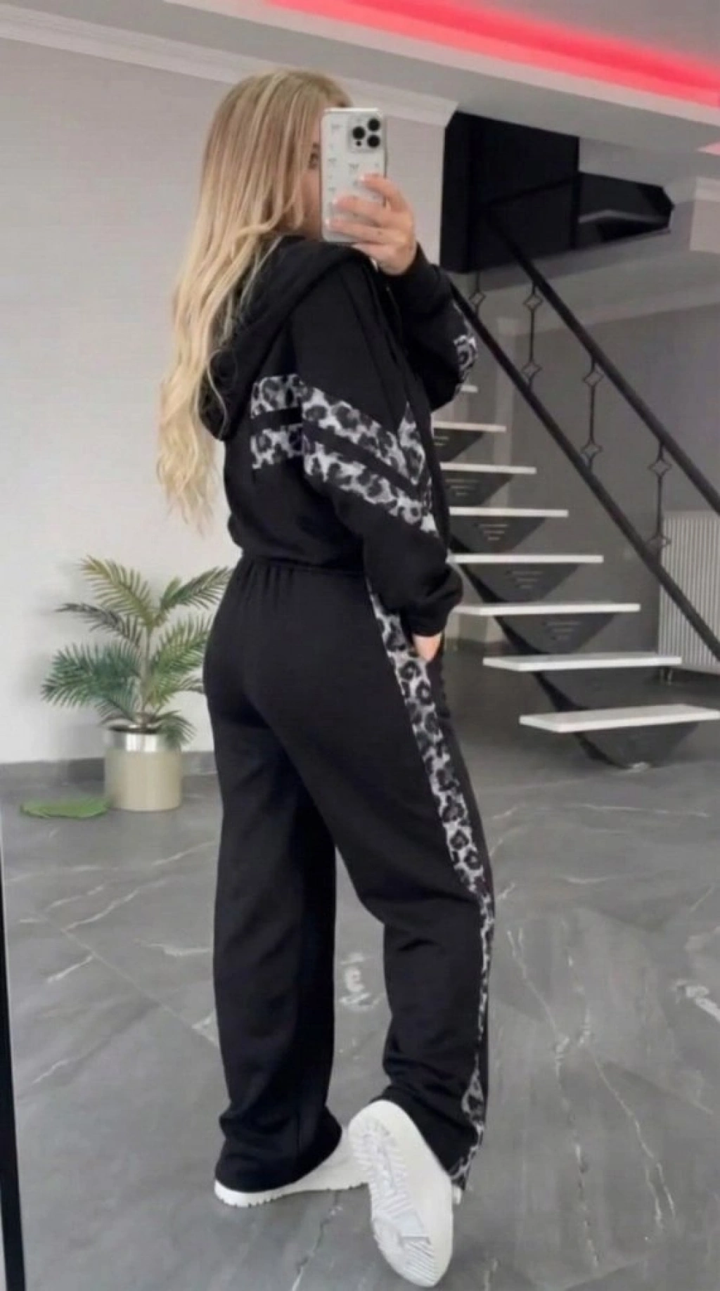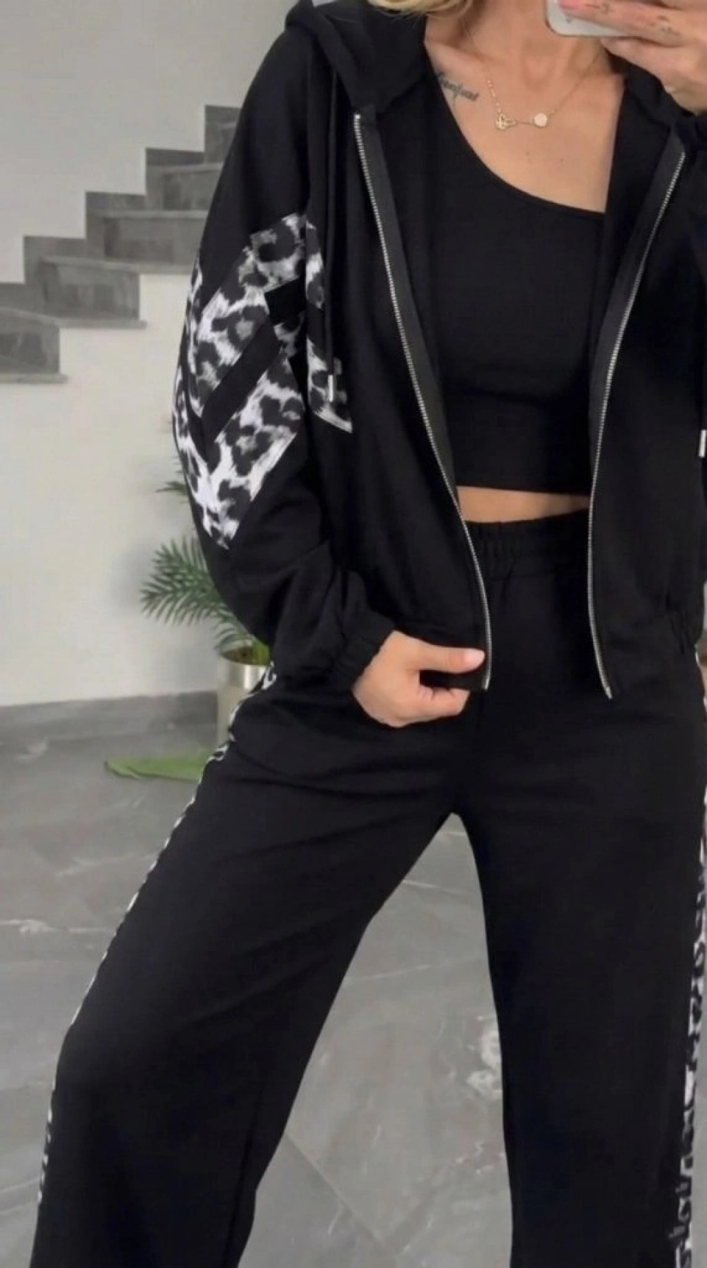 Kadın Uzun Kollu Kapşonlu önü Fermuarlı Leopar Desenli Modal Bluz Ve Pantolon Ikili Takım