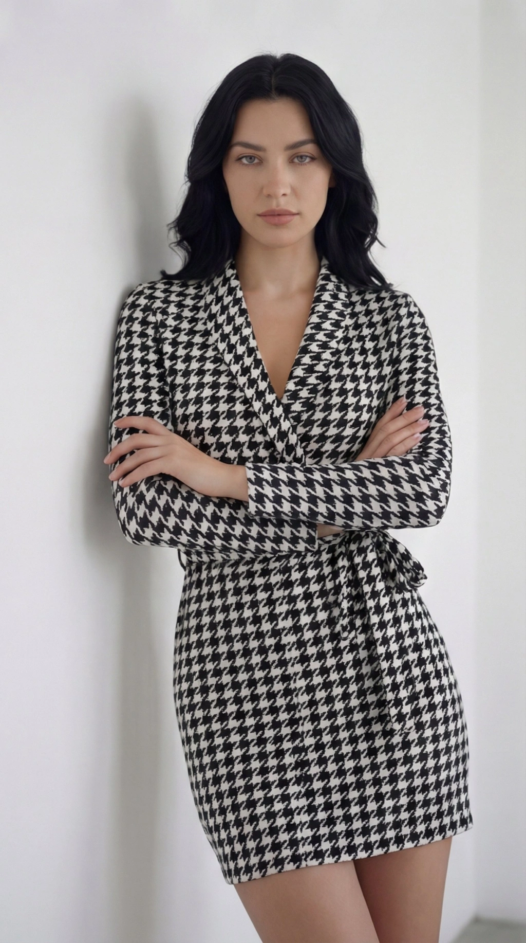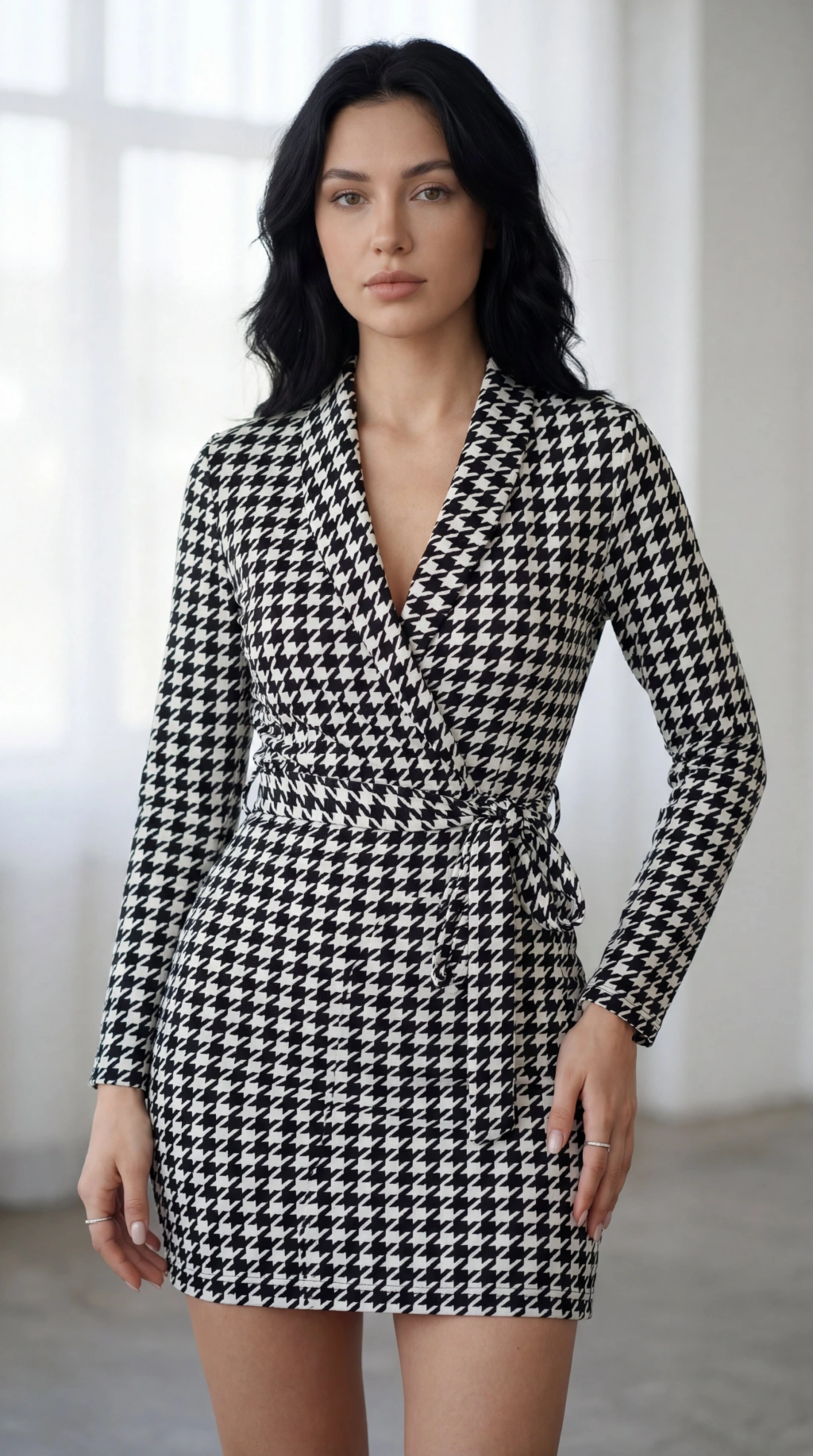 Kadın Uzun Kollu Kruvaze Yaka Bağlamalı Kemer Dalgıç Mini Boy Elbise