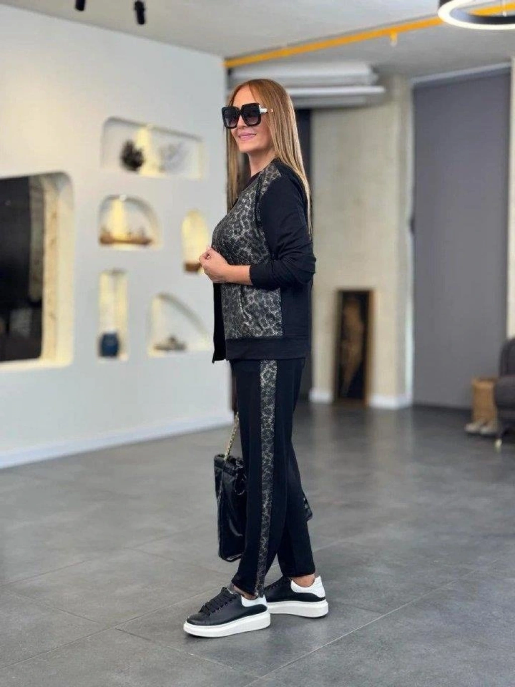 Kadın Uzun Kollu önden Fermuarlı Leopar Desenli Viskon Iki Iplik Bluz Ve Pantolon Ikili Takım