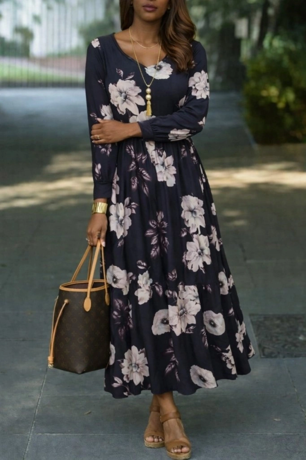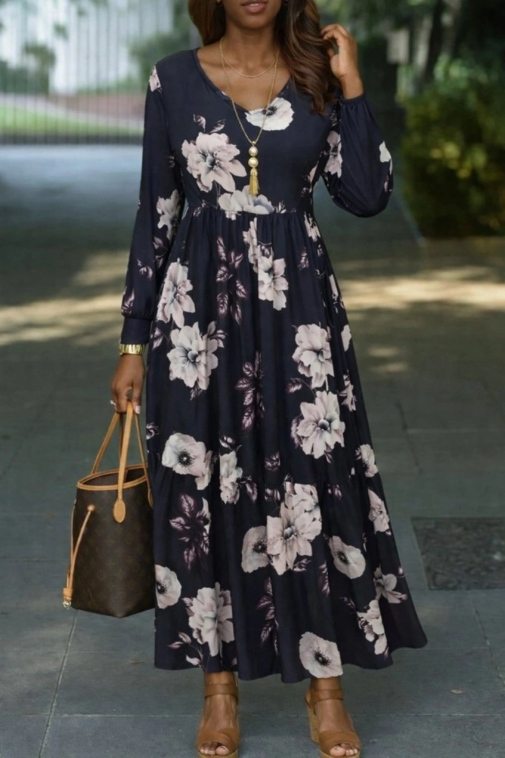 Kadın Uzun Kollu V Yakalı çiçek Desenli Maxi Süprem Elbise