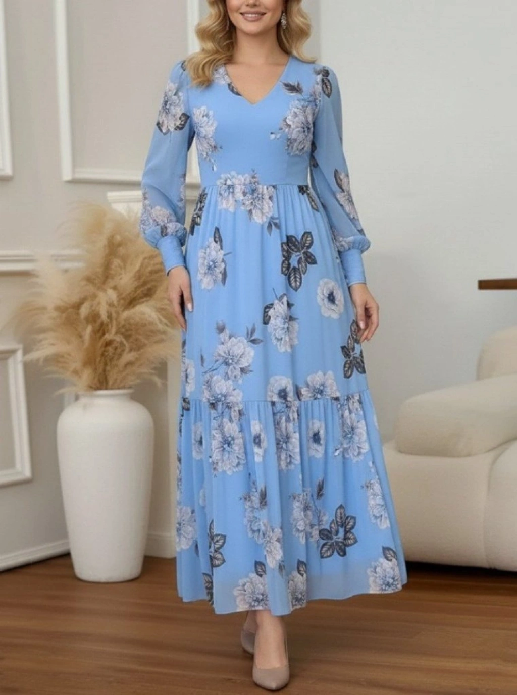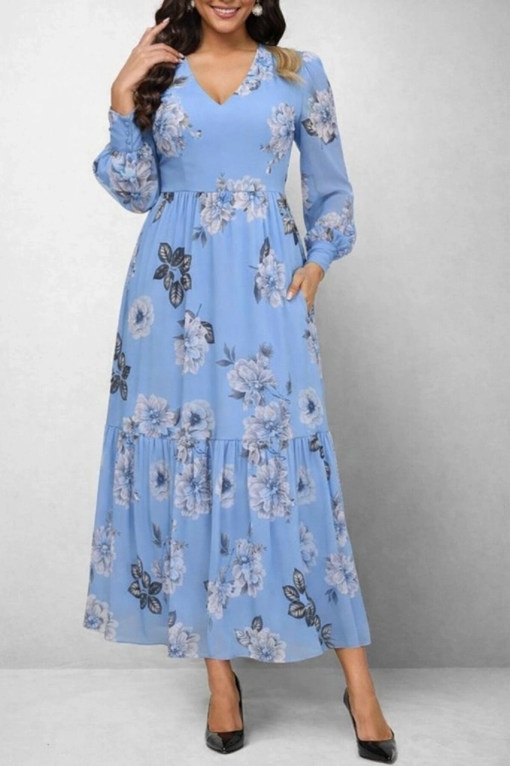 Kadın Uzun Kollu V Yakalı çiçek Desenli Maxi Süprem Elbise