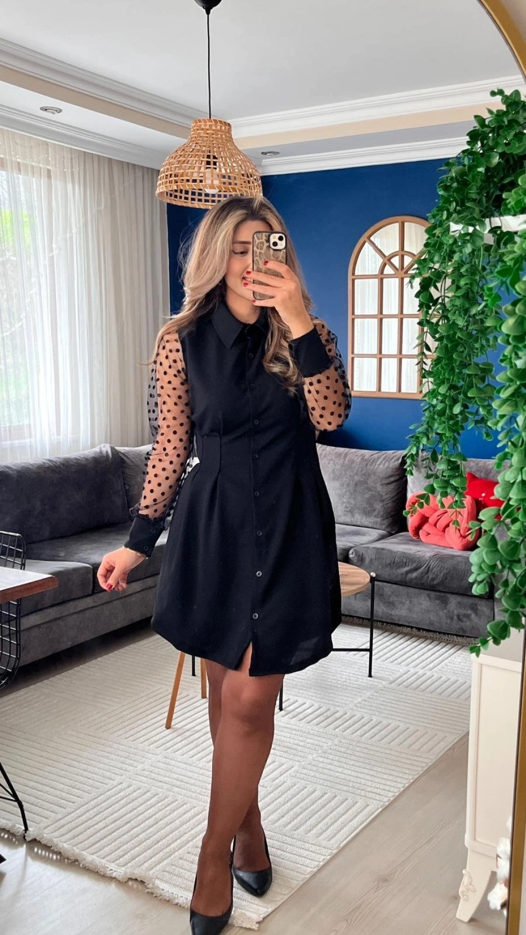 Kadın Uzun Kollu Yakalı Düğmeli Mini Ithal Krep Elbise