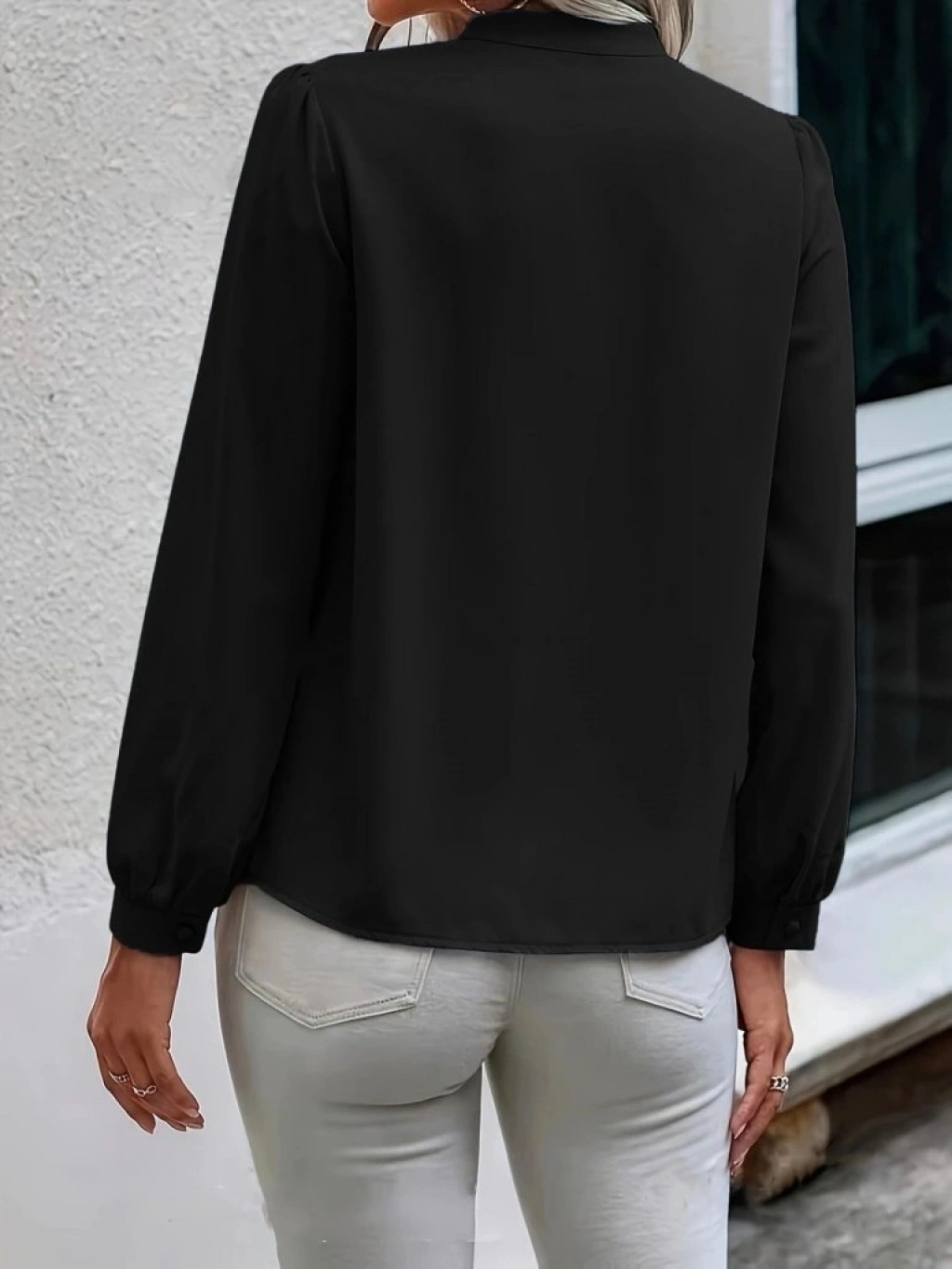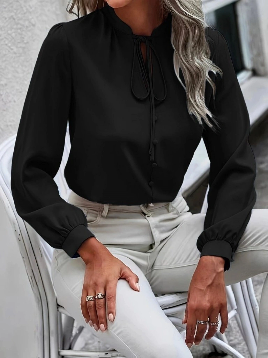 Kadın Uzun Kollu Yakalı Yakadan Bağcıklı Düğmeli Sandy Bluz
