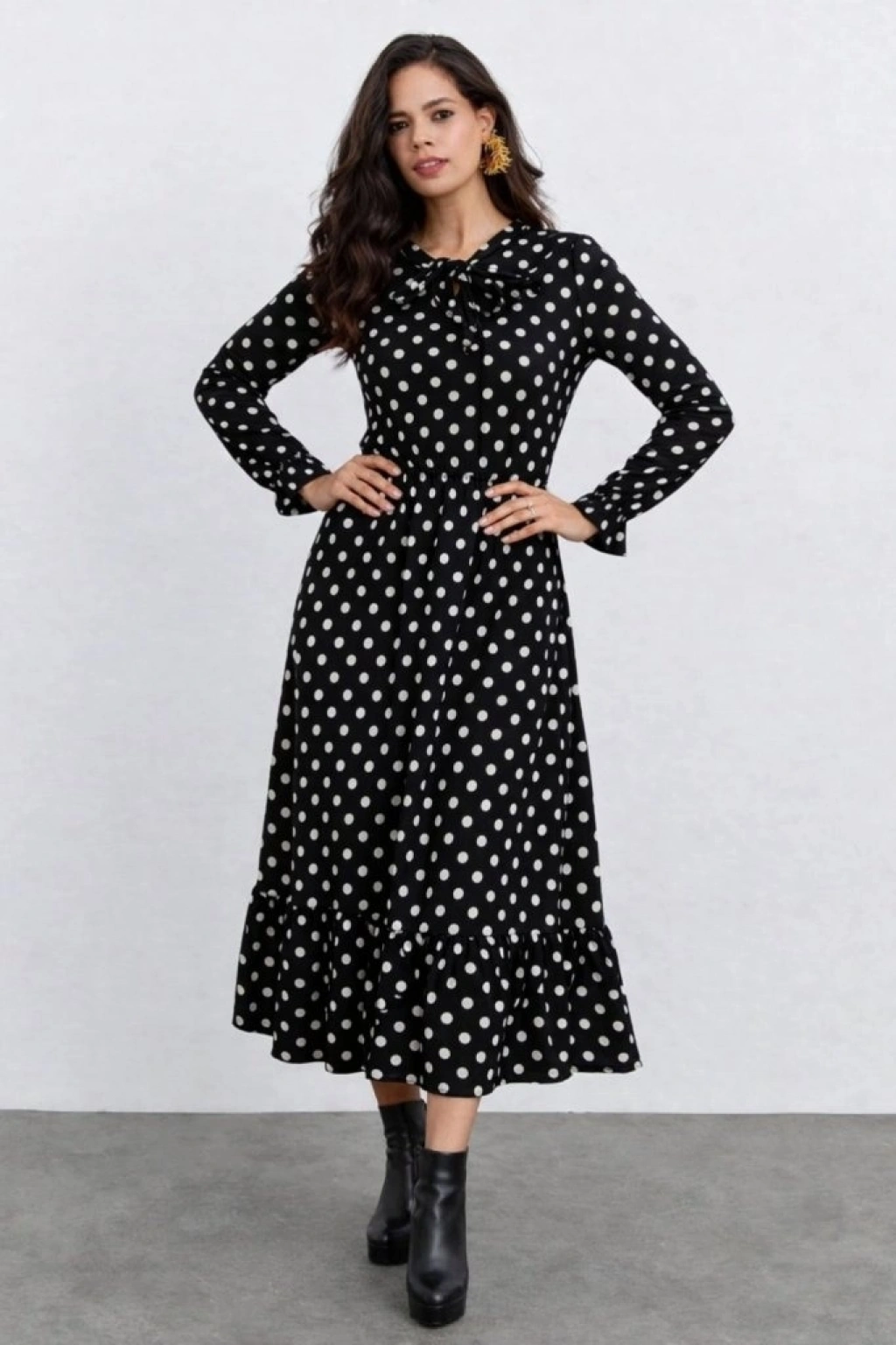 Kadın Uzun Kollu Yakası Bağcıklı Uzun Puantiyeli Krep Maxi Elbise